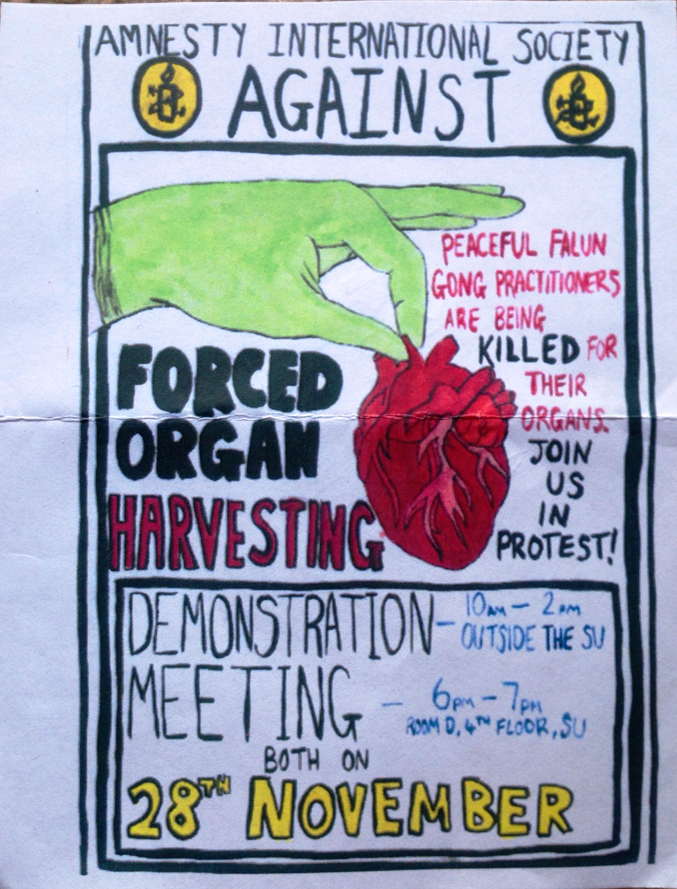 ![]() 图3活动组织者设计的传单, 上面写着:“和平的法轮功学员正在被杀害、被盗用器官”、“大赦国际组织反对强摘器官”、“加入我们的抗议!” |