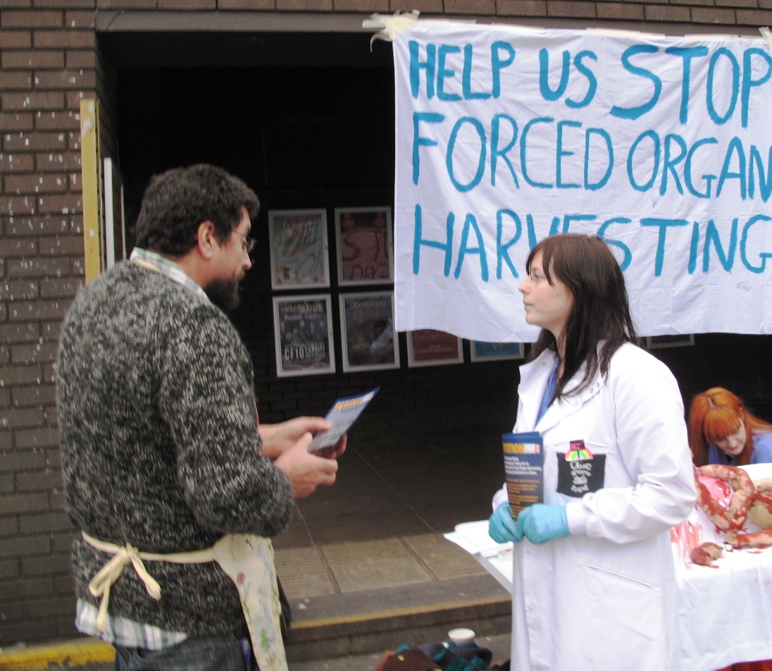 ![]() 图1-2:2013年11月28日,大赦国际组织卡迪夫大学分部成员在校园里进行反强摘器官征签 |