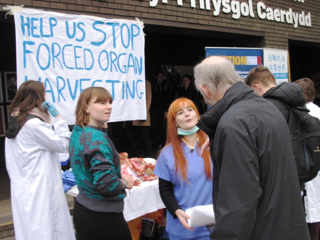 几天前,威尔士国民议会“中共活摘器官说明会”的组织者收到艾姆珀的电子邮件。她在信中邀请说明会的主讲嘉宾到大赦国际组织卡迪夫大学分部的例会上披露中共活摘器官的惊人事实。大卫·乔高(David Kilgour)和伊森·葛特曼(Ethan Gutmann)等说明会主要发言人未能到会,但几位积极支持反强摘器官征签的义工,也是几位英国的法轮功学员来到卡迪夫支持该活动,他们带来了DAFOH反强摘器官请愿征签宣传条幅和传单,也带来了法轮功真相资料。