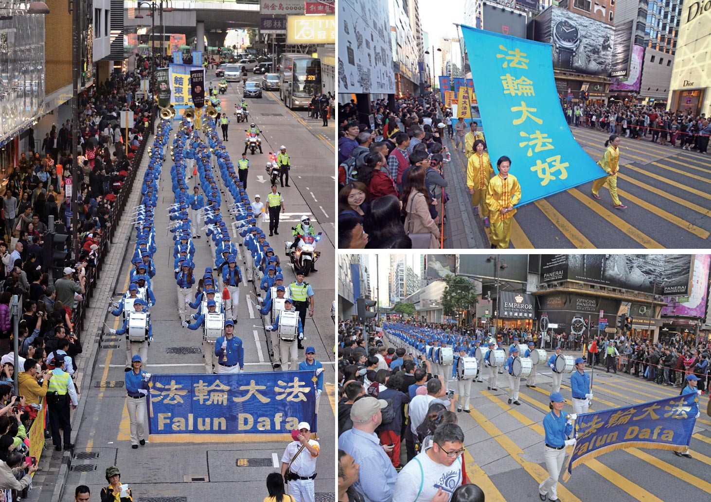 下午两点多,法轮功学员的游行队伍从九龙长沙湾游乐场出发,天国乐团为前导,后面是演示功法的队伍、和平理性反迫害旗阵、旗鼓队、真相旗阵、腰鼓队组成的游行队伍浩浩荡荡,一路在天国乐团吹奏《法轮大法好》、《法鼓法号震十方》等乐声中,穿越九龙、旺角闹市主要街道,游行队伍经过沿途,吸引道路两侧的广大民众以及游客观看,不断有人拿起手机、相机等拍摄游行画面。许多大陆游客,他们对声势浩大的游行场面感到震撼。