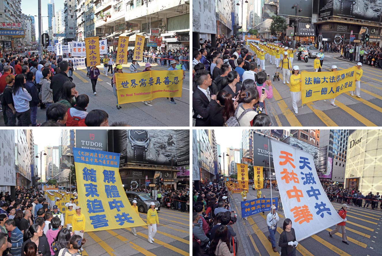 在游行活动开始前,几百名法轮功学员一早聚集在九龙长沙湾游乐场炼功,下午,游行前的简短集会上,《大纪元时报》总编郭君在集会上发言表示:“九年前,大纪元发表《九评共产党》系列社论,在中国大陆掀起一场道德觉醒运动,至今超过一亿五千多万中国民众声明退出中国共产党、共青团、少先队组织,而这个数字每天都在增长中。《九评》和三退,已成功帮助成千上万的中国人脱离中共邪恶政治,摆脱了中共的精神枷锁和捆绑,走向新生,找回道德勇气,以摧枯拉朽之势解体中共,《九评》发表的九年给中国和世界带来巨变。”