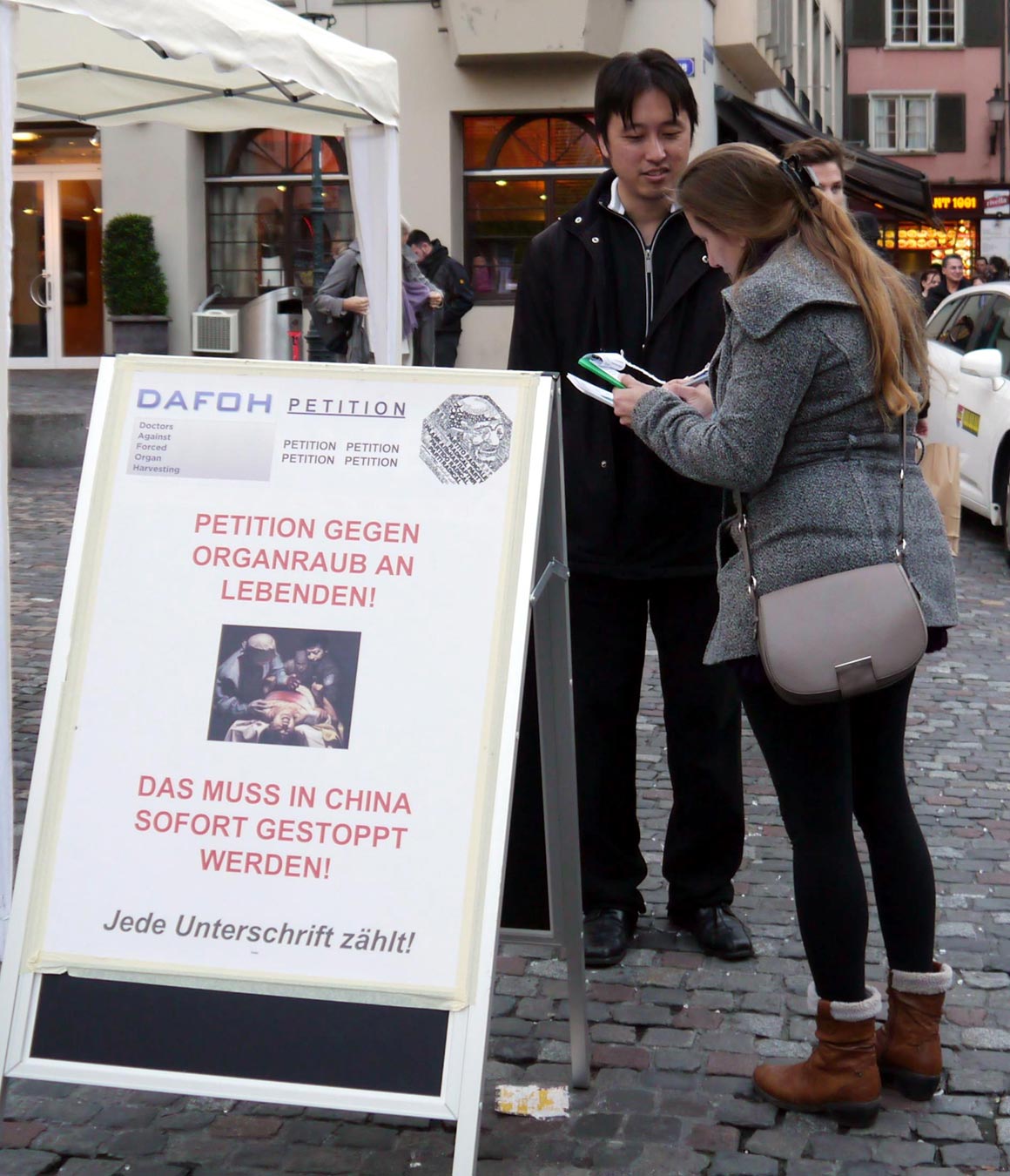 ![]() 二零一三年十一月九日,在苏黎世 Hirschenplatz,人们纷纷签名谴责中共活摘器官 |