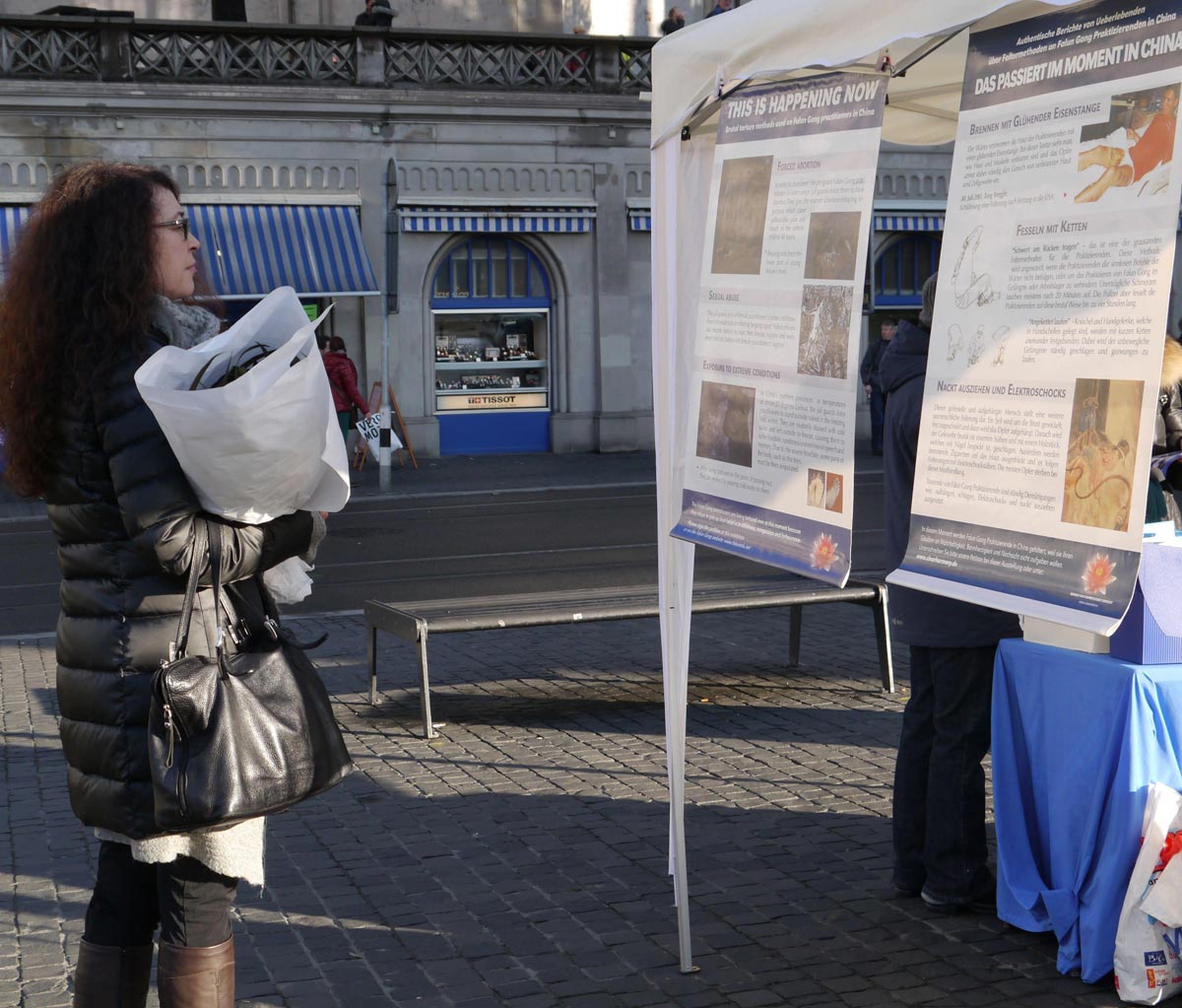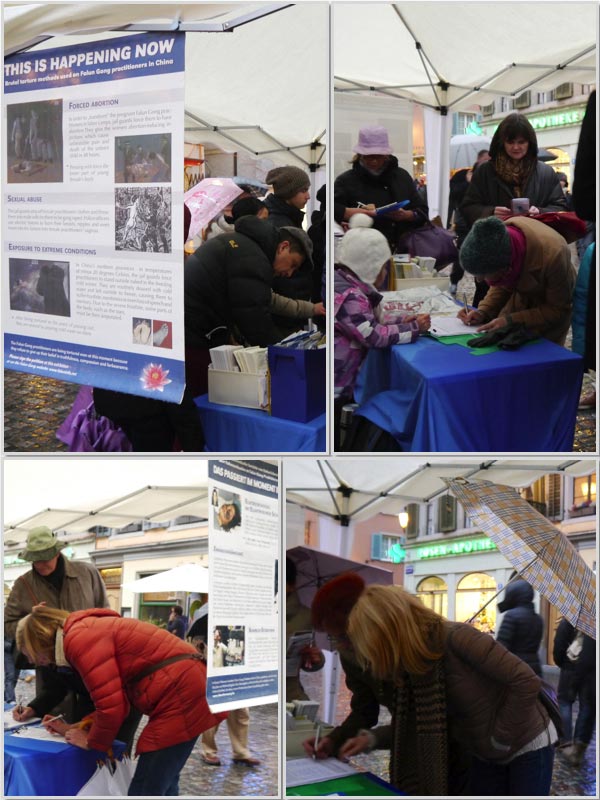 两个多月来,每个周六法轮功学员都在苏黎世和周边的城市设置信息摊位,向路人揭露正在中国发生的中共对法轮功学员的迫害以及活摘法轮功学员器官的罪行。