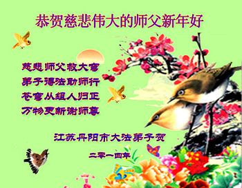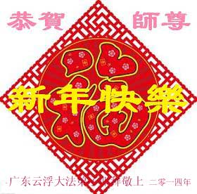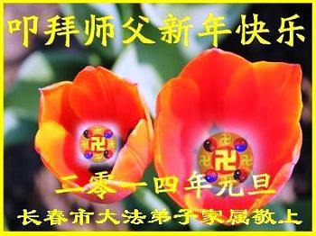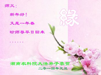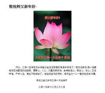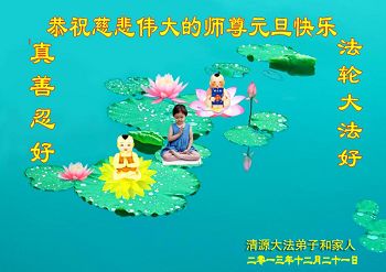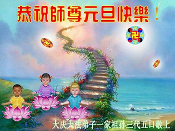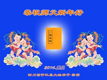 我们家族祖孙四代三十余口一直相信法轮大法,敬重李洪志大师。因为我们的亲戚中有数名大法弟子,从他(她)们身上让我们看到了法轮大法的美好、纯正与神奇,我们家族也跟着受益多多,每个家庭都平安幸福,吉祥如意,喜事接连不断,这是我们相信大法、敬重李大师得到的福报。因此,特借二零一四年元旦来临之际,我们全家向李大师表示最诚挚的感谢!恭祝李大师元旦快乐!
