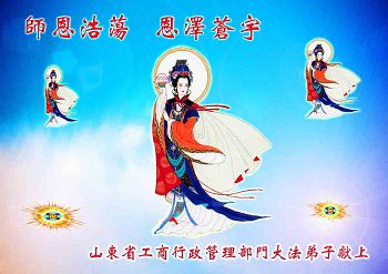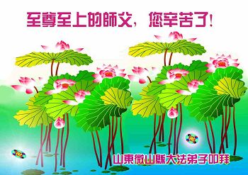 李大师您好!我们代表所有的亲朋好友向您问好!我们衷心感谢您的救度洪恩!大陆现在是人人自危,人们都生活在极度的恐怖之中,一不小心就会丢掉小命!这都是中共的无神论带来的,人们不相信有神灵,不相信善恶有报,昧着良心挣钱。唯有您的法轮功弟子才是真正的好人,放在哪里都让人放心。可是邪恶的中共却对这样一批好人進行残酷的迫害!中共的暴行怎能不让所有善良的人们寒心!邪党不亡,中国是永远没有希望的!我们希望早一点结束这暴行,回归天理良知,给所有善良的人们一个交代,我们相信那一天不远了!因为自古以来邪不胜正,所有行恶的都没有好下场。再一次跪谢慈悲伟大的李大师给了我们得救的机会!