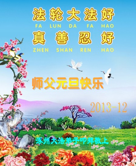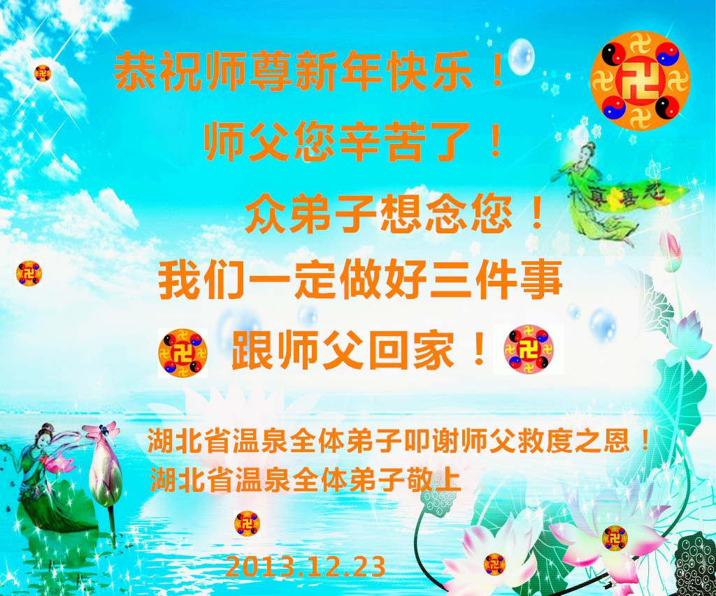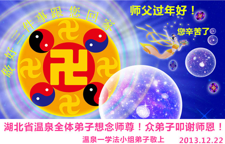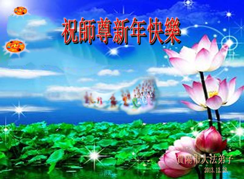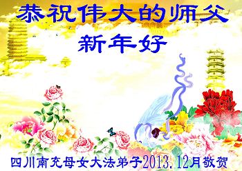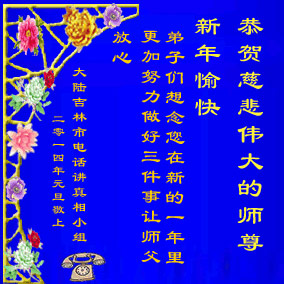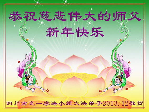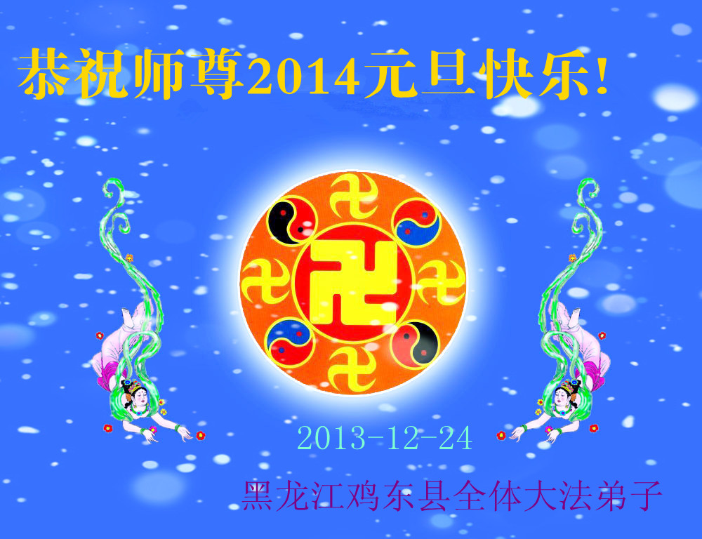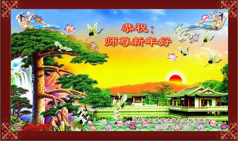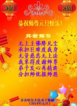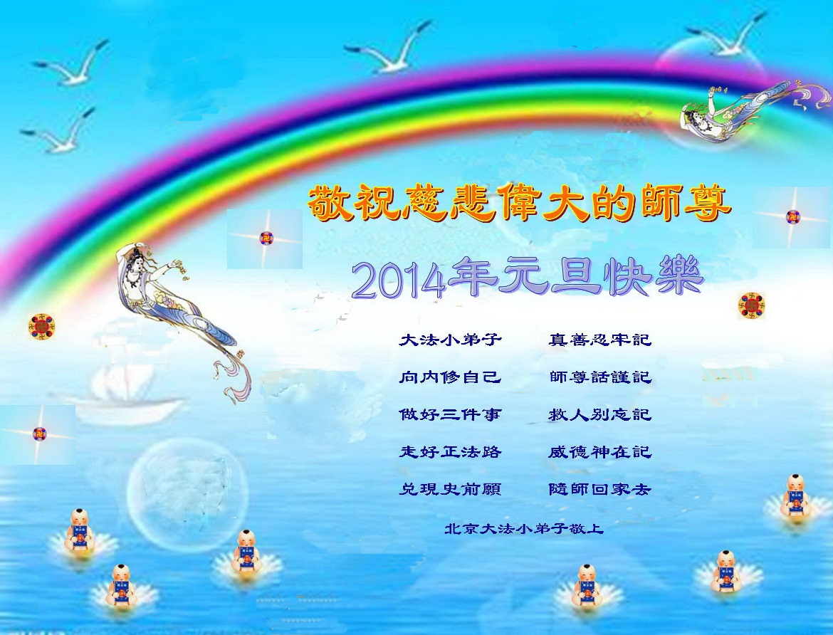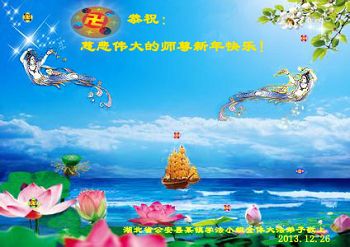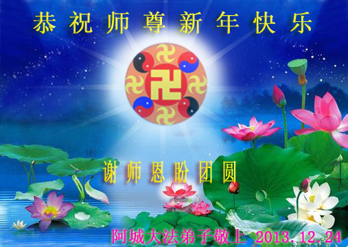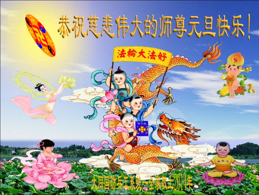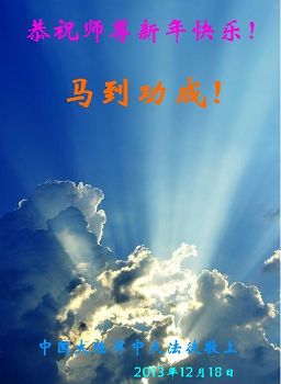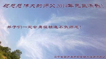 恭贺师尊二零一四年正法一帆风顺!感谢师尊救度之恩,我们一定紧跟正法進程,抓紧讲清真相,反迫害,除邪魔,开创出崭新的天地。 中国人民防空系统大法弟子 二零一三年十二月二十四日