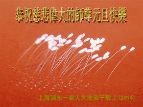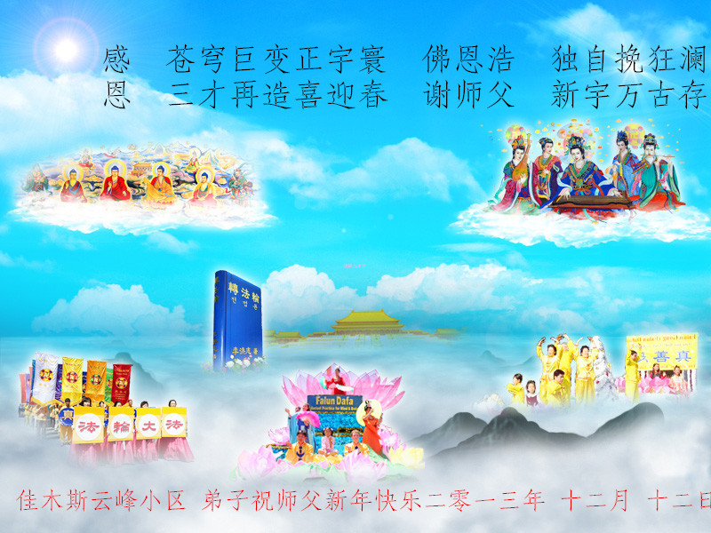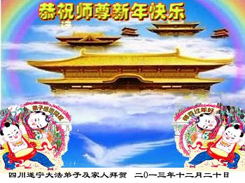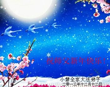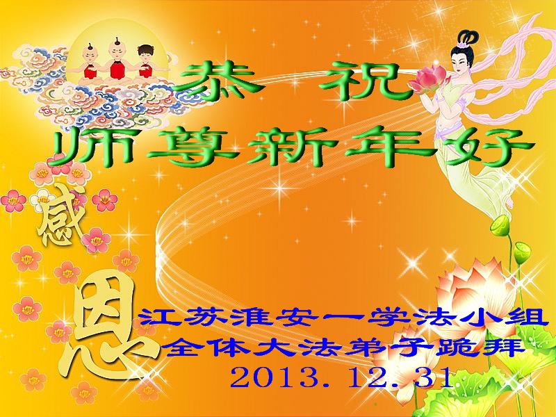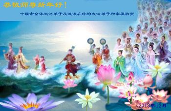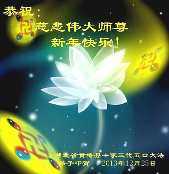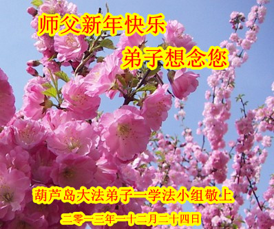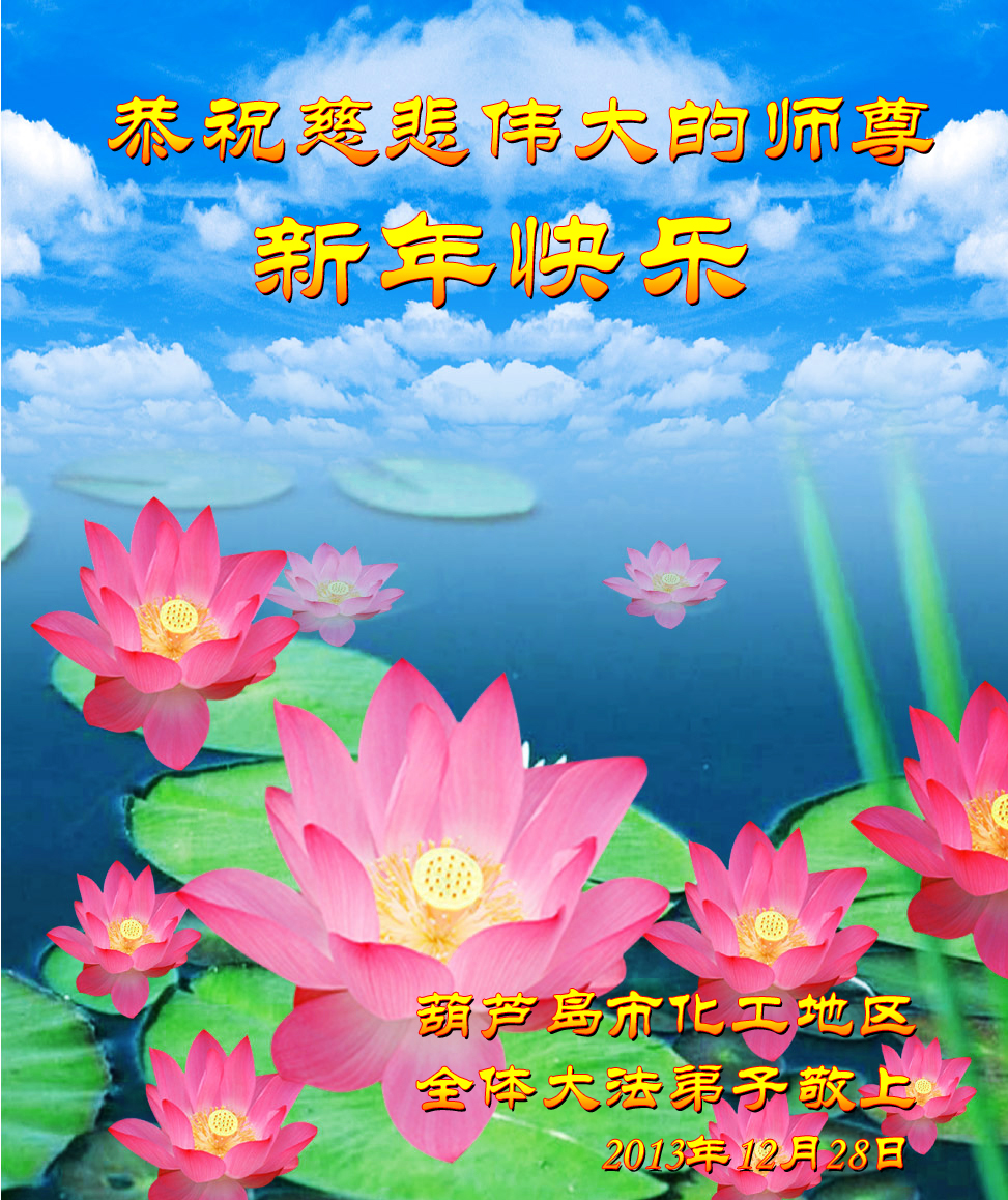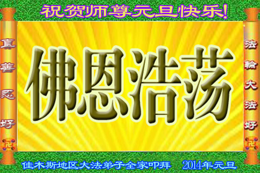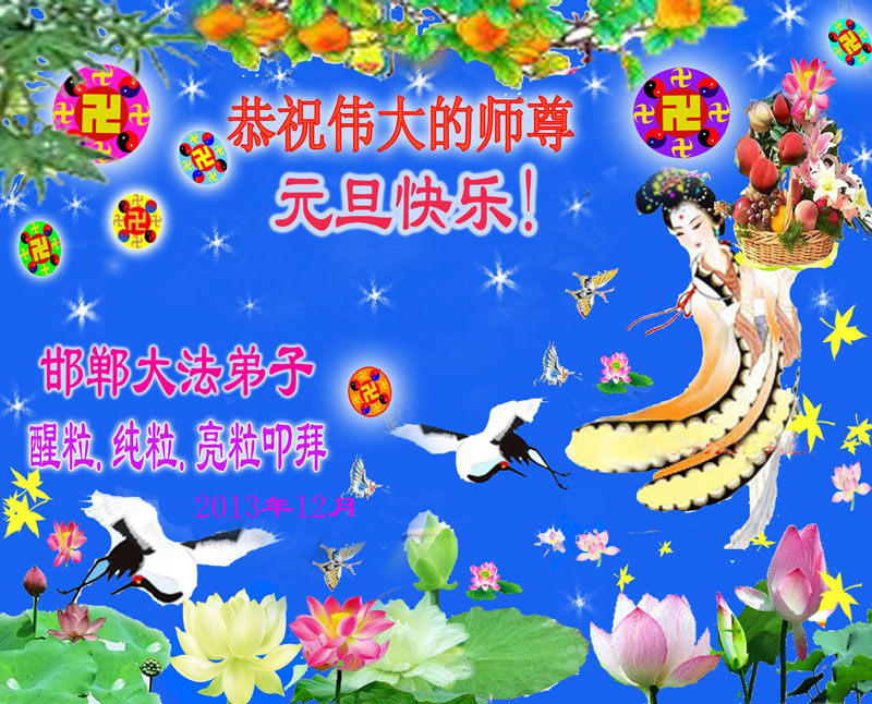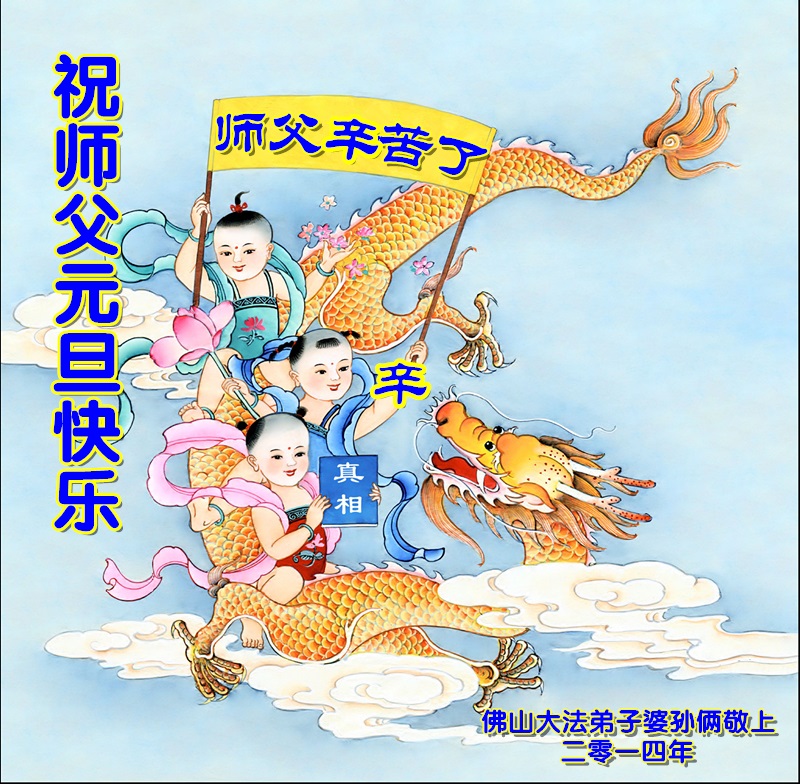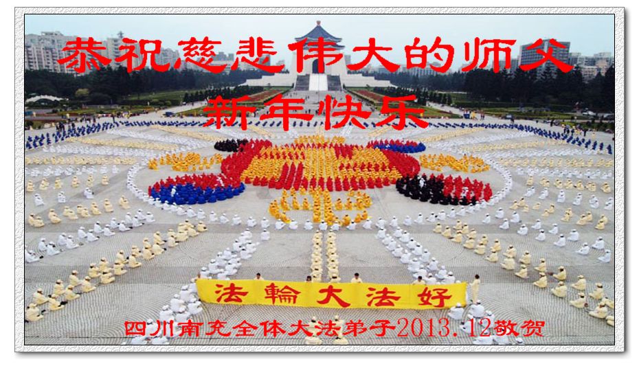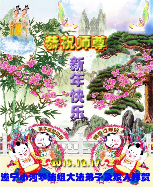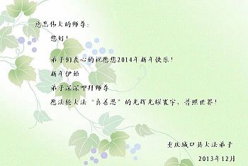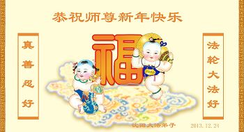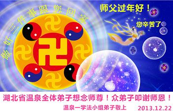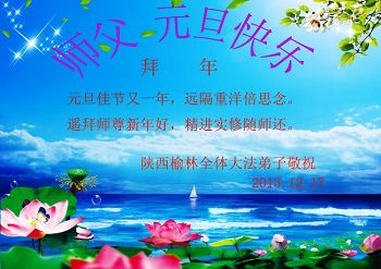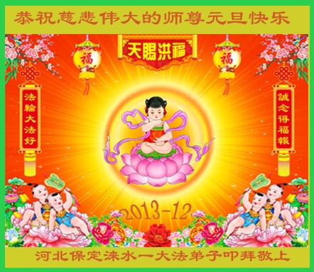 恭贺师尊二零一四年正法一帆风顺!感谢师尊救度之恩,我们一定紧跟正法進程,抓紧讲清真相,反迫害,除邪魔,开创出崭新的天地。 中国人民防空系统大法弟子 二零一三年十二月二十四日