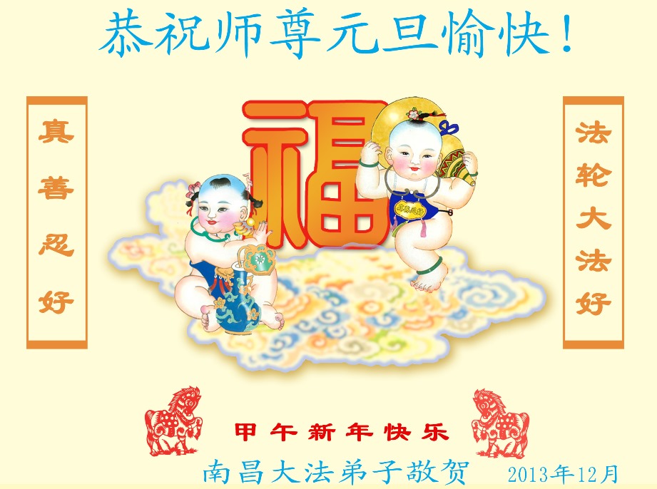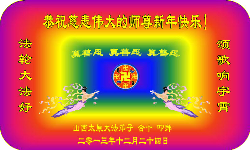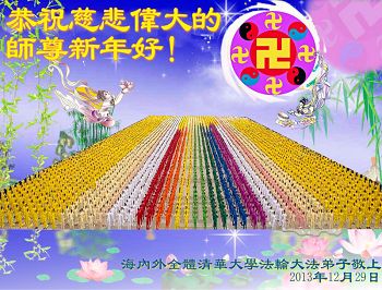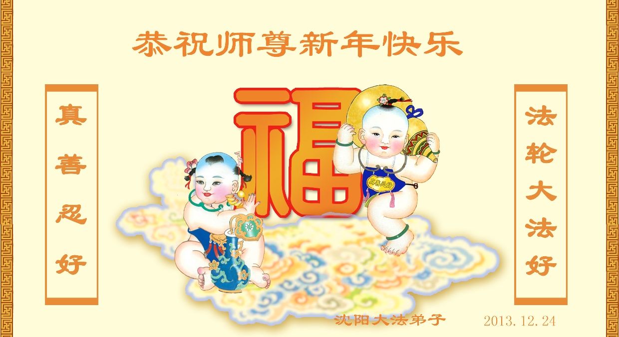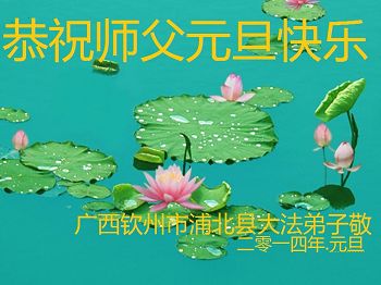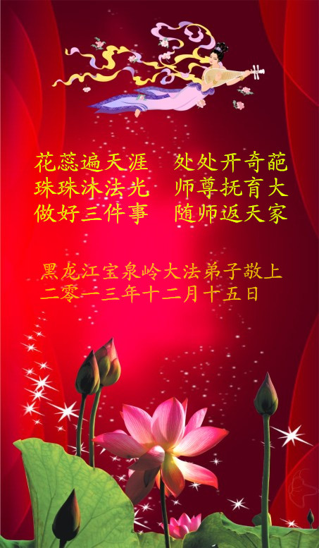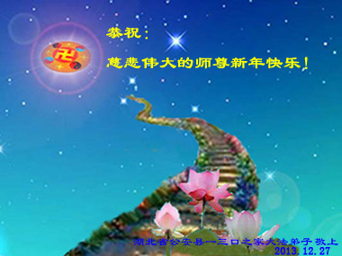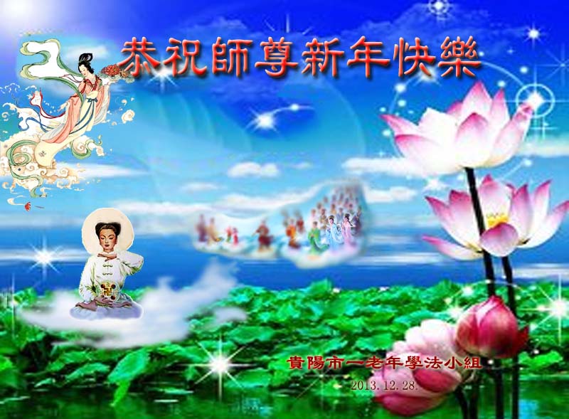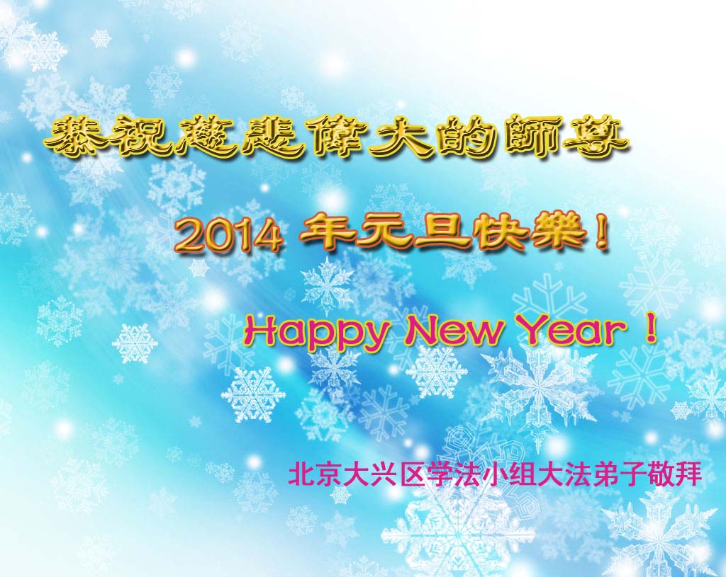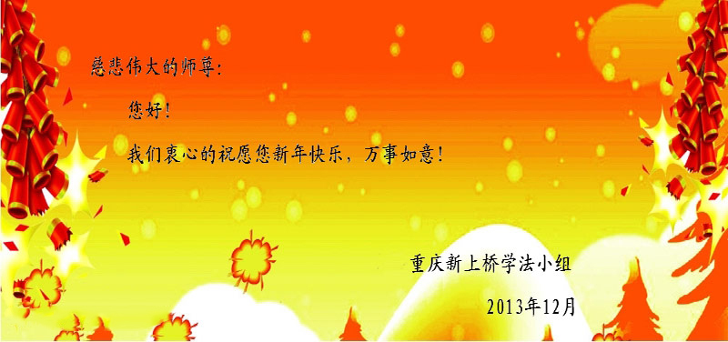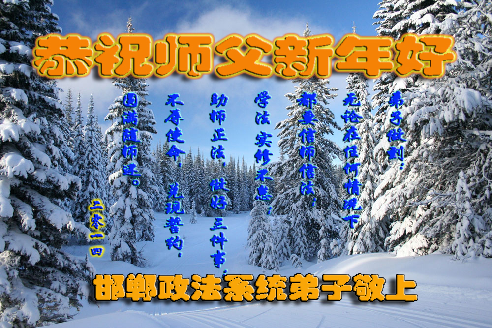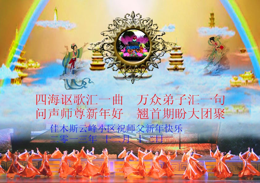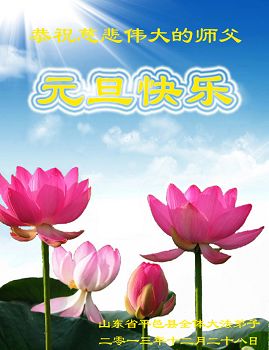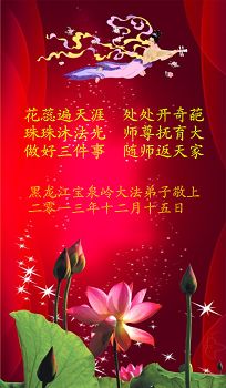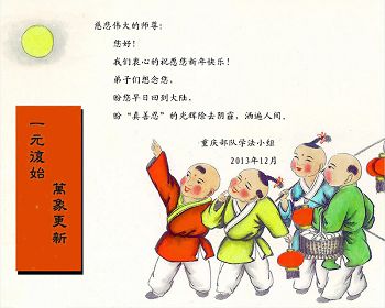 恭贺师尊二零一四年正法一帆风顺!感谢师尊救度之恩,我们一定紧跟正法進程,抓紧讲清真相,反迫害,除邪魔,开创出崭新的天地。 中国人民防空系统大法弟子 二零一三年十二月二十四日