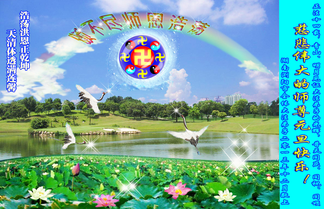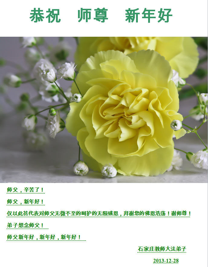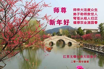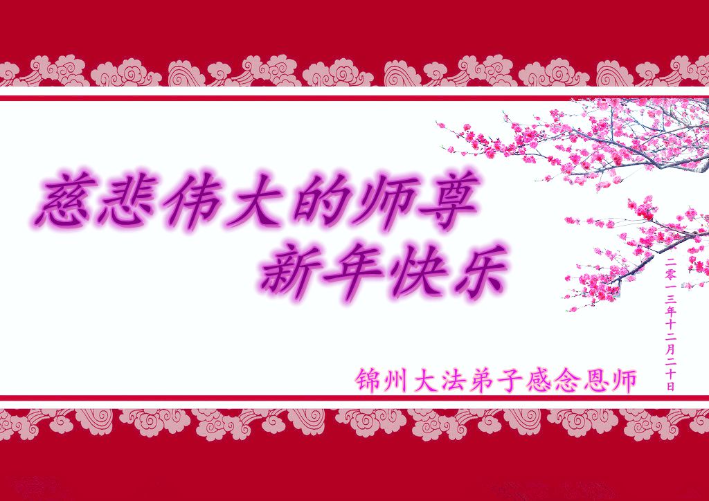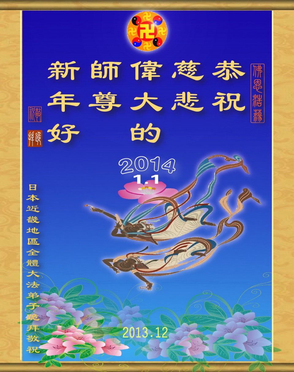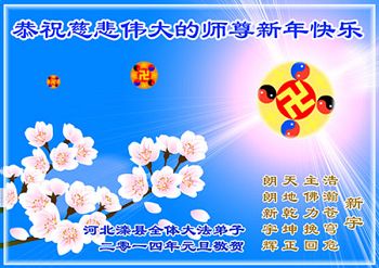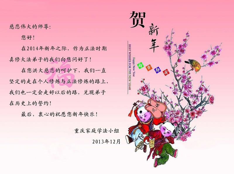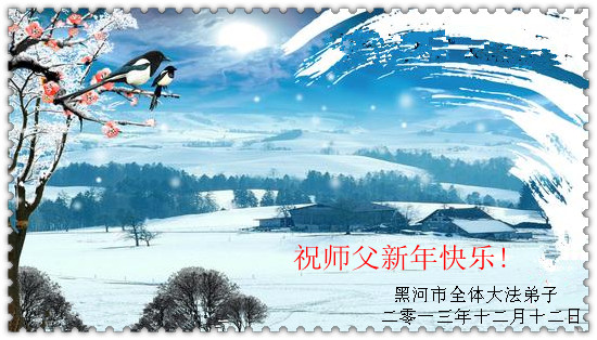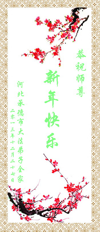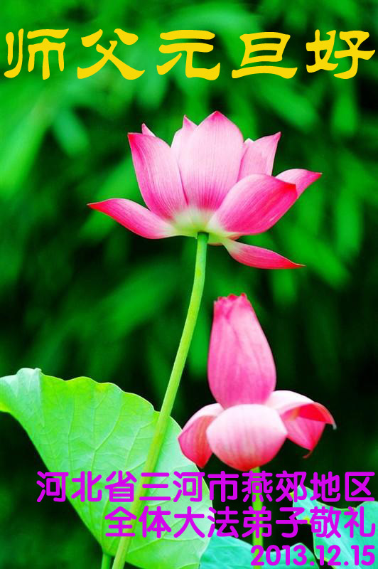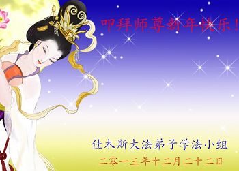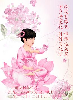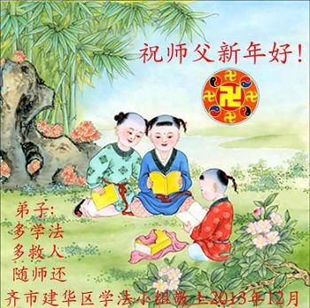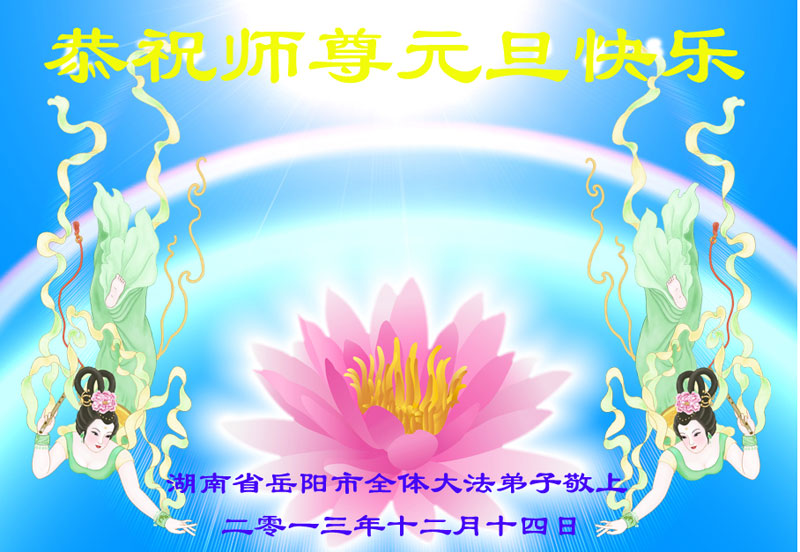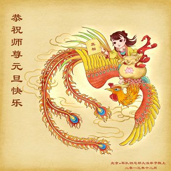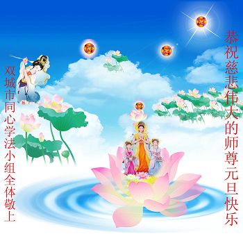 恭贺师尊二零一四年正法一帆风顺!感谢师尊救度之恩,我们一定紧跟正法進程,抓紧讲清真相,反迫害,除邪魔,开创出崭新的天地。 中国人民防空系统大法弟子 二零一三年十二月二十四日
