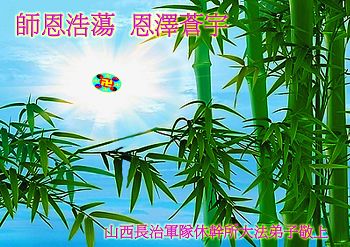 感恩伟大的师尊对我们的慈悲救度!勇猛精進是对弟子始终不变的要求,在这开天辟地的正法时期,能够荣幸的成为师尊的弟子,是弟子生命永远的荣耀!弟子唯有按照师尊的教导,严格的遵照真善忍宇宙大法的标准衡量自己的一言一行,无条件的同化大法,配合整体,共同证实大法,救度众生,才能做一个合格的大法粒子跟师尊圆满的回家!