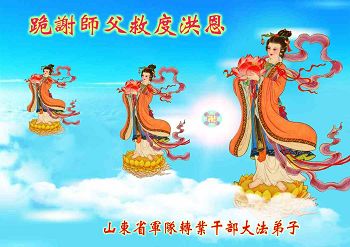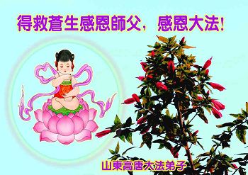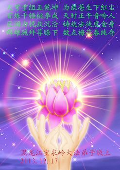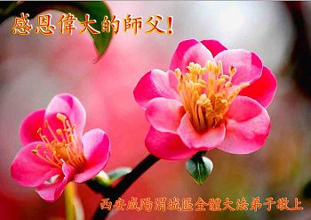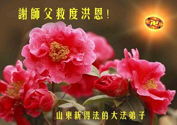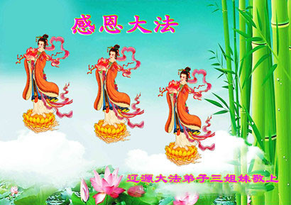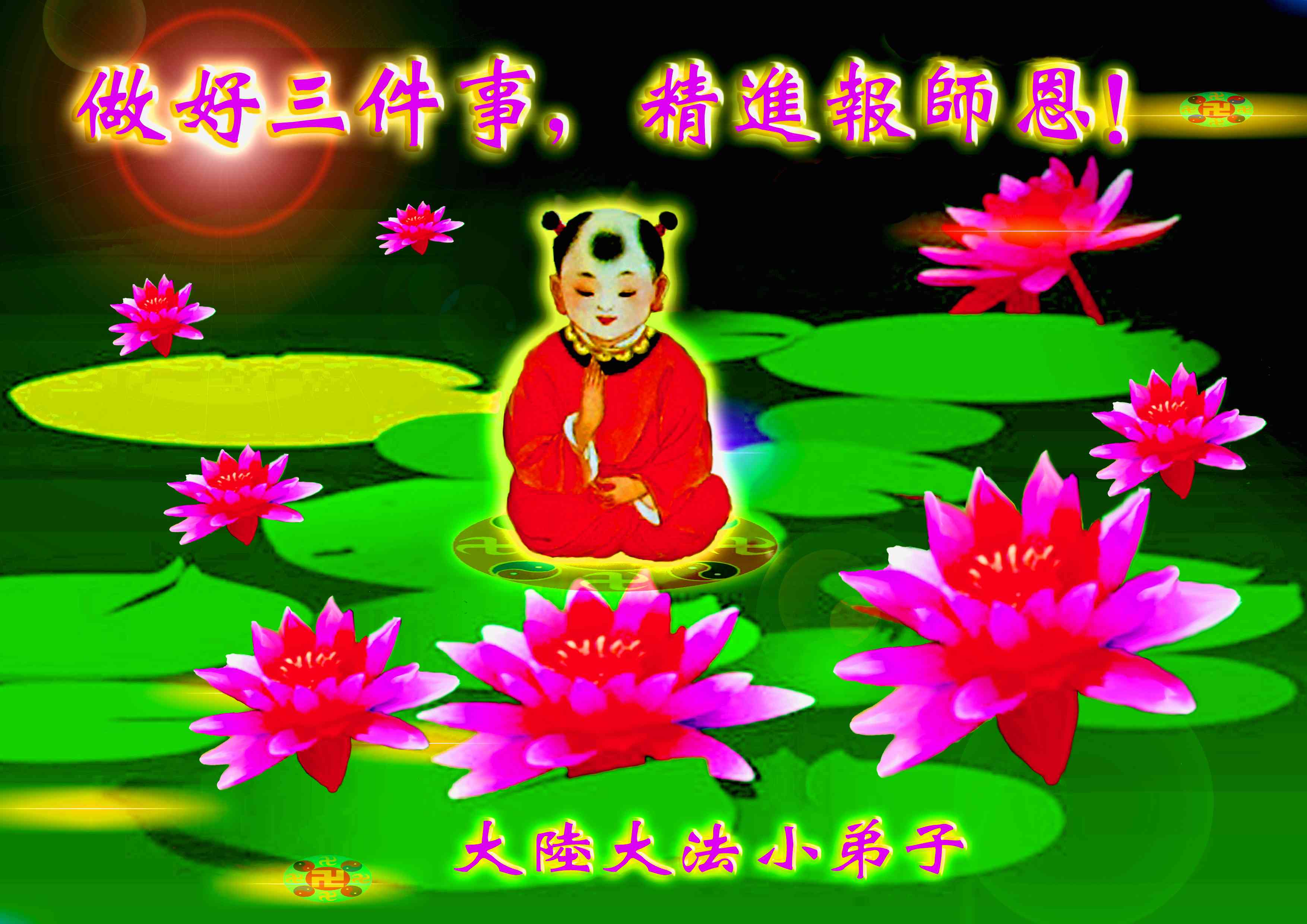 弟子感恩师尊慈悲救度!弟子在生生世世的轮回转世中,苦苦等待了几千年,终于等到了师尊来人间洪传宇宙大法,给了弟子同化大法的机会,弟子一定珍惜这千载难逢的神圣机缘,修好自己,不忘助师正法、救度众生的神圣使命,利用一切机会唤醒那些被邪党毒害的生命,给他们一个选择美好未来的机会,不要使他们随着邪党的解体做了陪葬品。