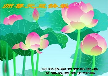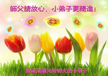我们非常想念师父。自从1999年邪党诬陷师父、疯狂迫害大法弟子以来,有的多次遭受迫害,有的在家人同修遭受迫害时能认清邪恶、支持同修,也有新走入大法修炼的弟子,都能坚定的证实大法,学法修心性,讲真相救世人。在这有限的时刻,我们决不辜负师父的教诲,更好的做好“三件事”,兑现誓约。跪拜师尊!