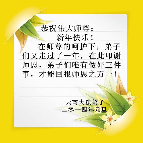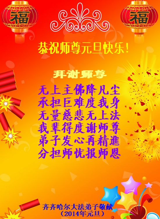 <英文版: http://en.minghui.org/html/articles/2014/1/3/144184.html>大陆军队大法弟子恭祝师尊元旦快乐(26条)