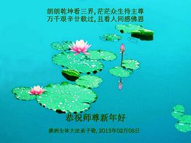 【明慧网二零一三年二月十五日】过年是中国人最隆重的传统节日,也是人们团聚、问候和感恩的日子。这些年来,在国际上出现了一道独特的风景:海内外的法轮功学员在新年佳节之际,发出自己真正的心声,向法轮功创始人李洪志先生拜年,并表达诚挚的敬仰和感恩。