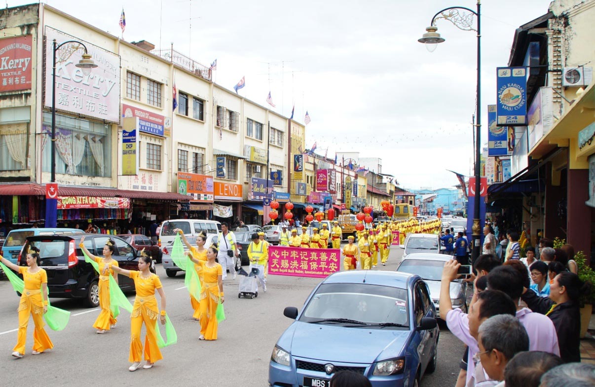 法轮功学员首先来到武吉甘密这朴素的市镇。法轮功学员的新年游行队伍包括天国乐团、灯笼队、舞龙队、仙女队和腰鼓队,上午十一时许开始出发,沿路吸引许多民众围观,壮观优美、充满传统文化气息的队伍引起民众的连连赞赏,并希望法轮功学员的游行队伍能够再来。