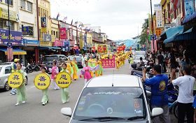 法轮功学员首先来到武吉甘密这朴素的市镇。法轮功学员的新年游行队伍包括天国乐团、灯笼队、舞龙队、仙女队和腰鼓队,上午十一时许开始出发,沿路吸引许多民众围观,壮观优美、充满传统文化气息的队伍引起民众的连连赞赏,并希望法轮功学员的游行队伍能够再来。