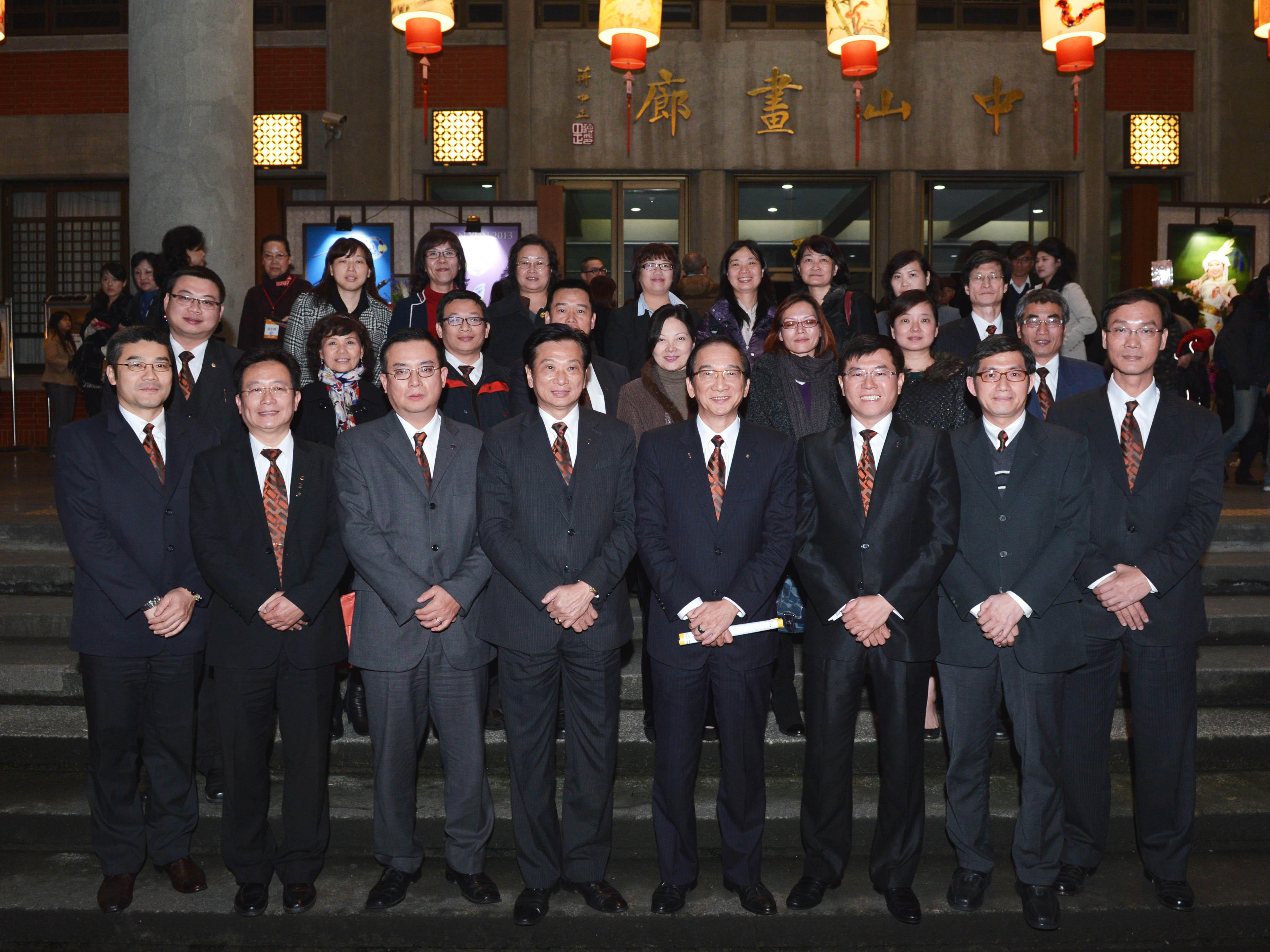 ![]() 侨茂不动产董事长李育宽(前排右4)和分店长、经纪人、眷属们共同观赏二零一三年神韵晚会,散场后在国父纪念馆前合影留念。 |