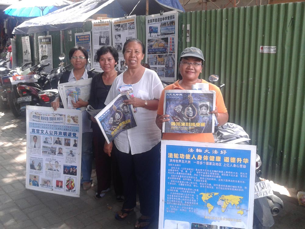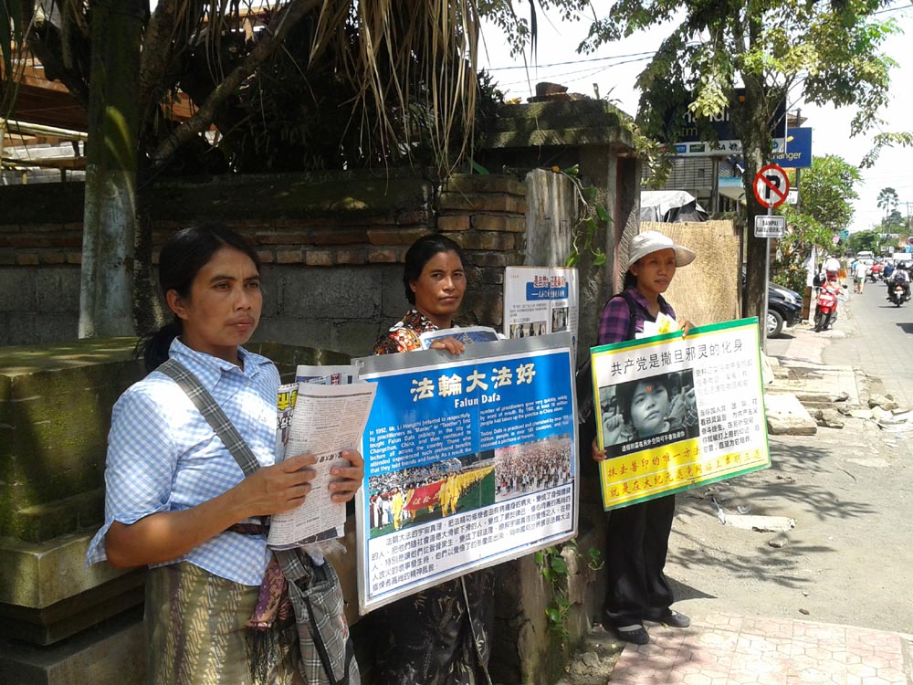 来自巴厘岛乌布小镇(Ubud Bali Indonesia)的大法弟子们,她们虽然不懂中文,但是丝毫不影响她们每天到旅游景点摆展板,给中国游客派真相资料。