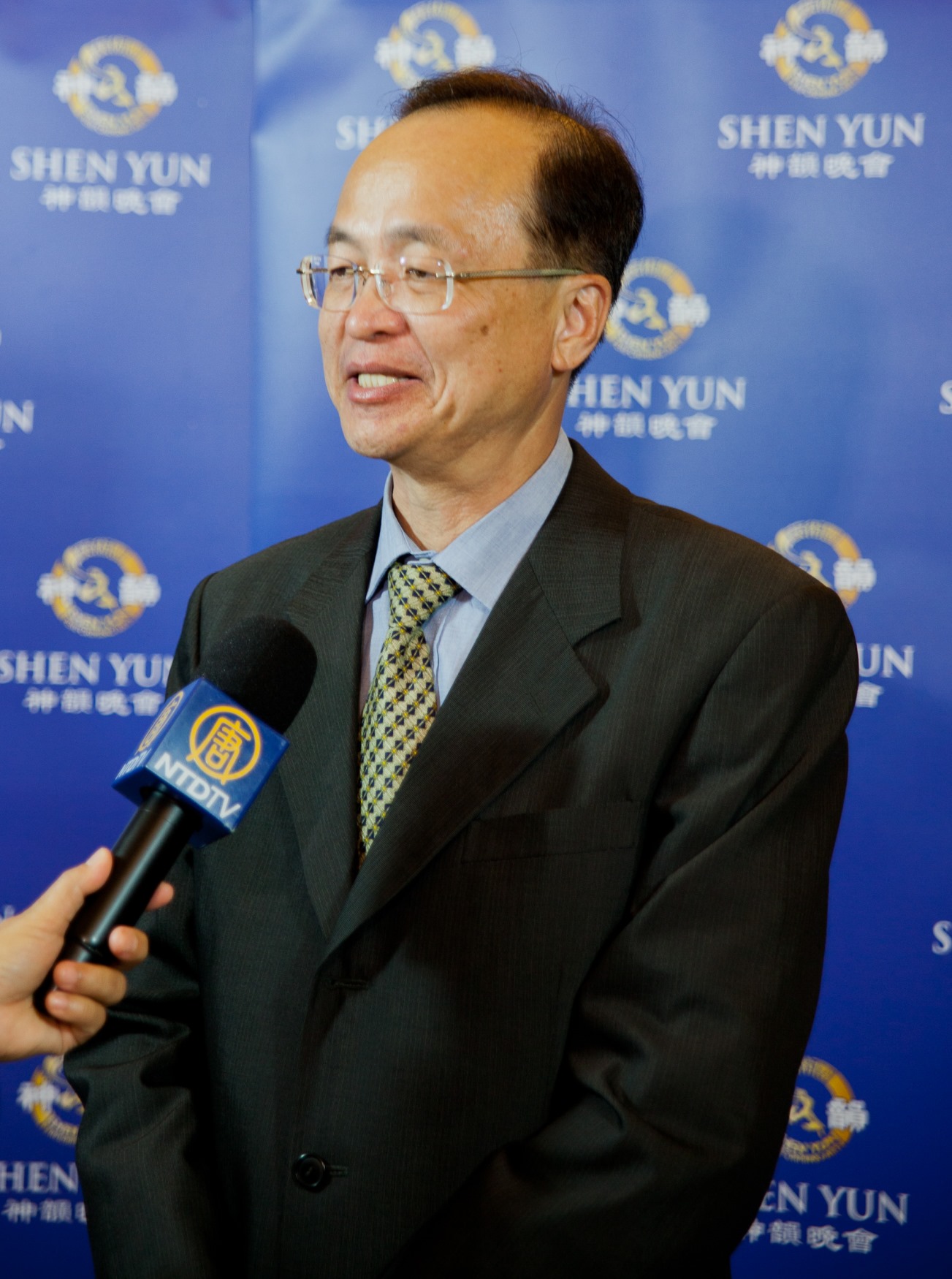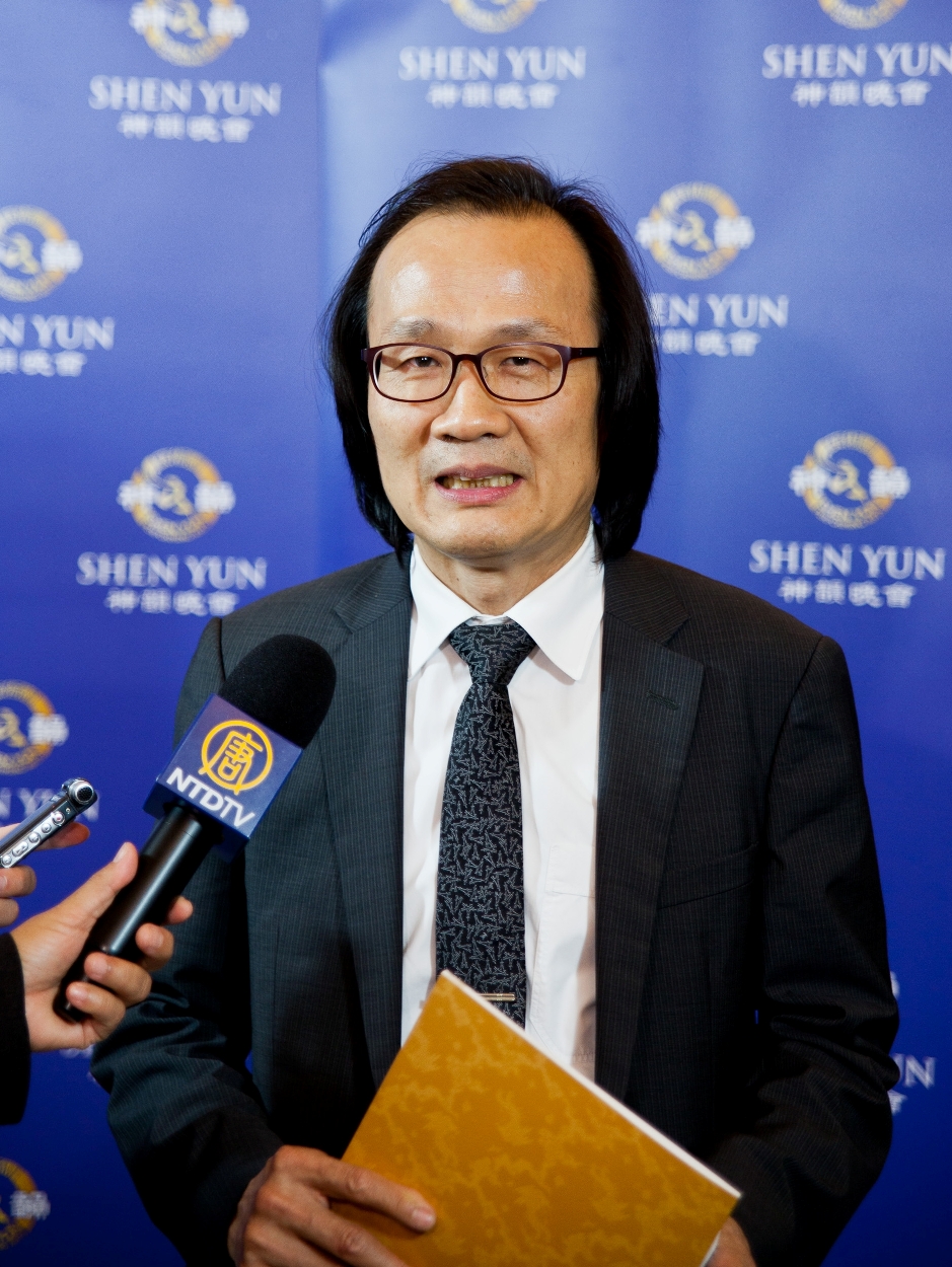 “我是整个从头到尾都震撼,神韵舞蹈的美、音乐的美、妙巧的不得了,包括舞台的设计,音响的设计,真的是很难得。”他兴奋地用“美、妙、忠、义。”来形容他此时对神韵的感受:“从技术面看,技巧都很纯熟,可以说是炉火纯青的境界。从学术上看,她选择的故事题材都很好。技术加上学术表现出的艺术,境界非常高,让我深受感动。”