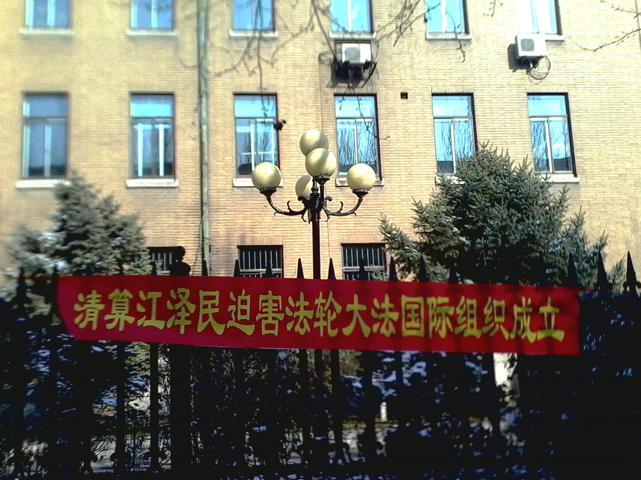 二零一二年十一月的某个周六,同修在讲真相的路上看到在辽宁省沈阳市的铁路局大楼前 挂上了“清算江泽民迫害法轮大法国际组织成立”的横幅,当时多人驻足观看。