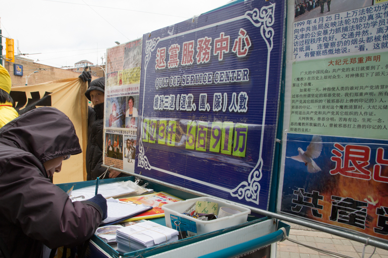 ![]() 多伦多法轮功学员在中区唐人街举行真相长城,现场讲真相劝三退及征签活动 |