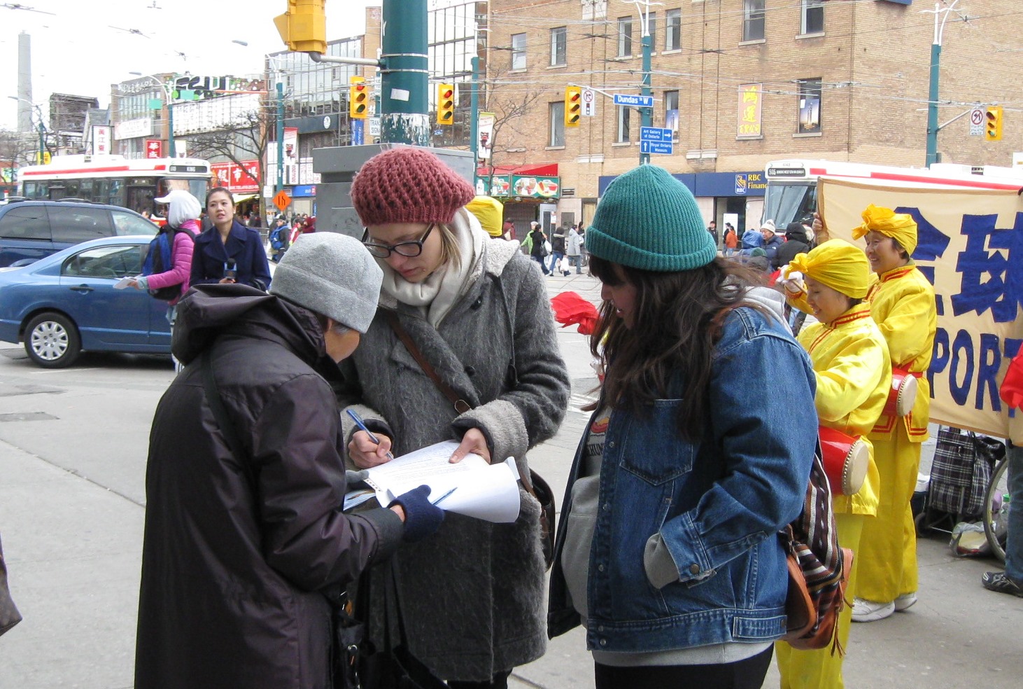 从今年二月开始,截至当天(四月二十日)加拿大多伦多已有超过五千民众在“制止中共活体摘取法轮功学员器官”的签名信中签名。这封签名信在加拿大国会由议员宣读了两次,引起政要们关注。目前,签名活动仍在继续进行。