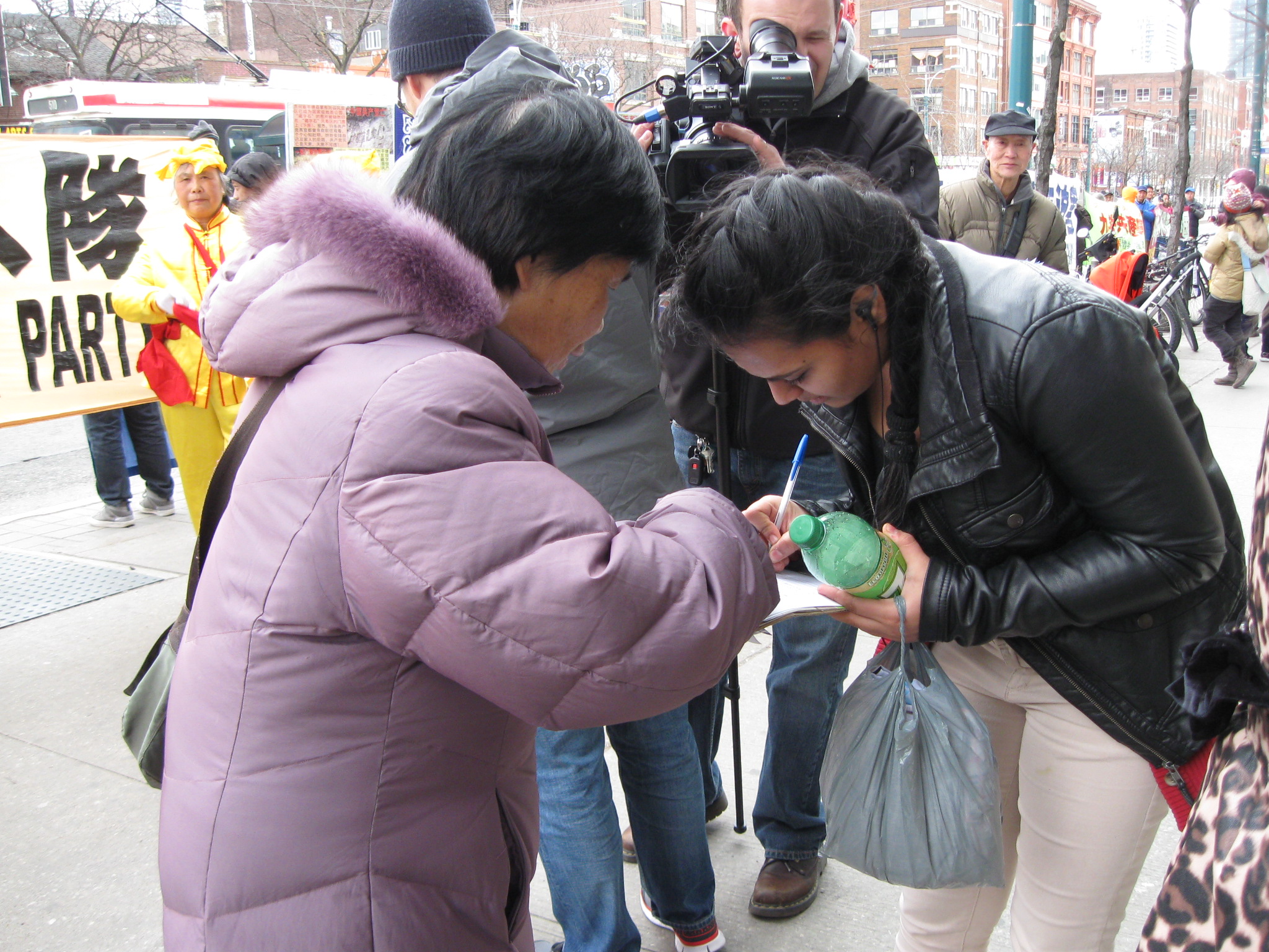 一位来自约克大学的学生签名后,留下了他的联络方式,他说要在大学同班同学中征集制止活摘器官的签名。一位亚裔社区领袖在街头遇到了征集签名的法轮功学员,他不但自己签了名,还告诉过往的加拿大人中国发生了什么,称签名就是制止中共的迫害。