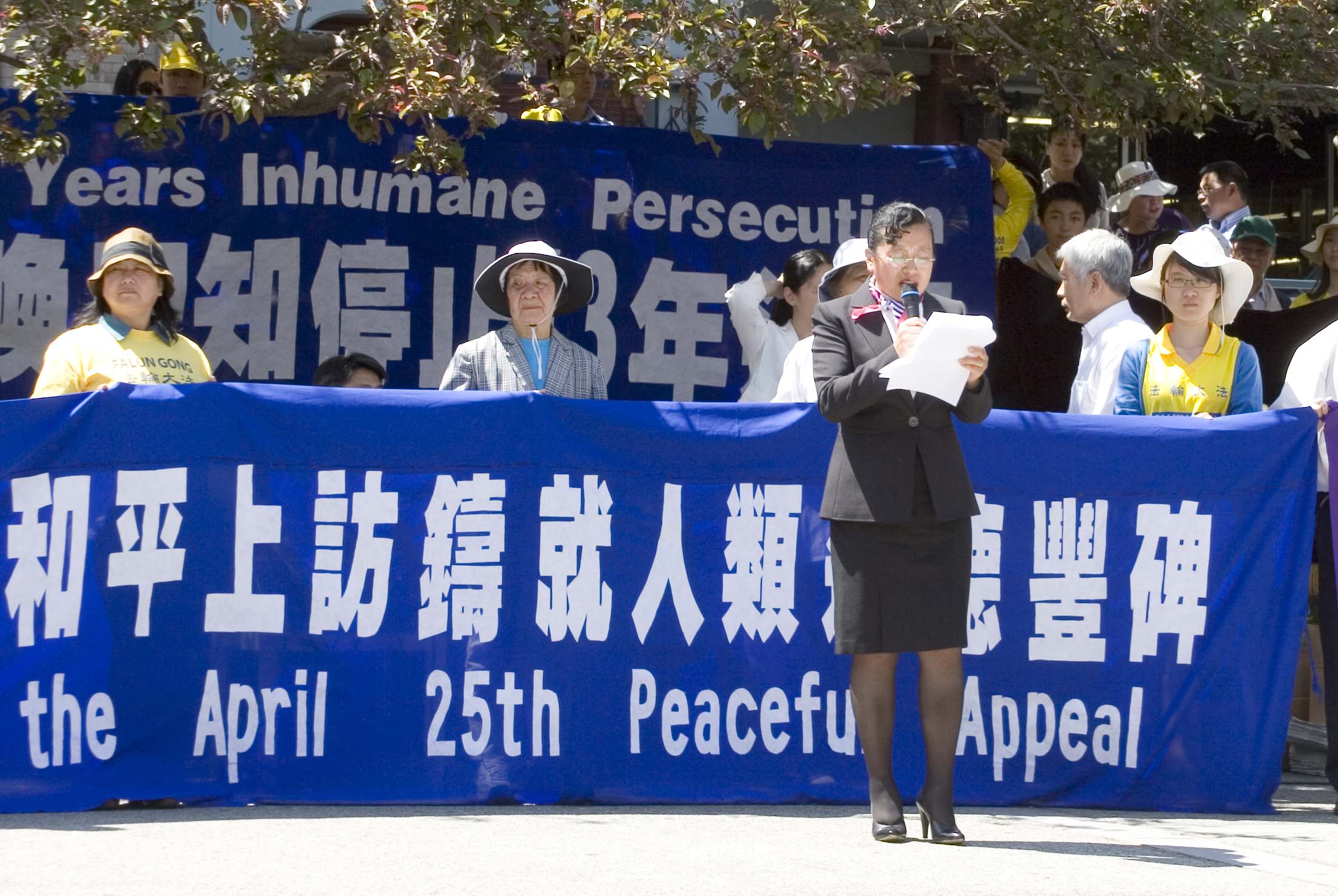 【明慧网二零一三年四月二十二日】(明慧记者王英旧金山报导)在“四二五”和平上访十四周年来临之际,旧金山法轮功学员在中国城举行系列讲真相活动。二零一三年四月二十一日,法轮功学员在旧金山花园角广场举行真相图片展和集会,向民众讲真相并纪念“四二五”和平上访。法轮功学员在现场打出“法轮大法好”、“四二五和平上访铸就人类道德丰碑”、“停止迫害法轮功 法办江罗刘周”等大型标语。有七位法轮功学员在集会上发言。