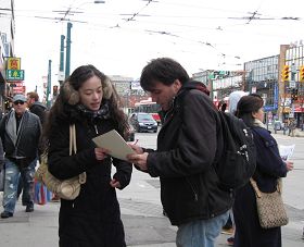 来自大陆的音乐教师王影在现场微笑着向过往路人讲真相。王影曾在一九八八年患心脏病,饱受疾病折磨,九死一生。曾经走遍大大小小的医院,都没有治好,后来炼法轮功以后,神奇般的好了。九九年中共开始镇压后,她被多次关押、劳教,经受魔鬼般酷刑迫害。曾在臭名昭著的吉林省黑嘴子劳教所关押两年。她说前不久明慧网报道的中共监狱、劳教所对女性法轮功学员的迫害,她都经历过。