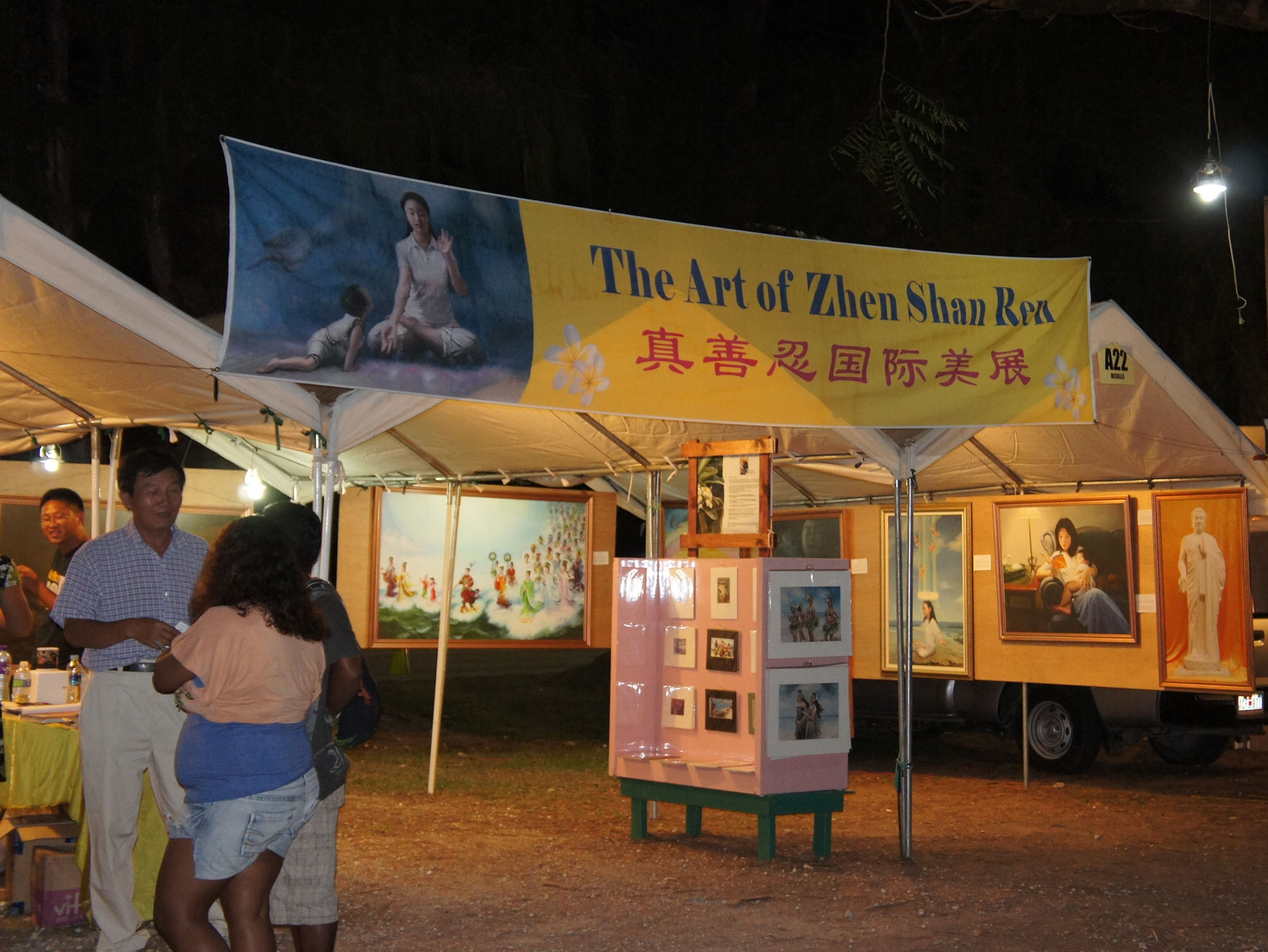 【明慧网二零一三年四月二十四日】为期三天的三十二届塞班岛火树节于二零一三年四月十九日至二十一日圆满落幕。塞班法轮大法佛学会也同以往一样应邀参加了此次活动。加拿大华裔画家陈肖平也前来火树节现场,同当地艺术协会人员一起探讨艺术,并讲述大法的美好与真相。展出的十几幅不同法轮功学员的作品让当地居民及游客观赏后,既表现出对作品中讲述的迫害不可思议,又对画家精湛的画艺表示欣赏。