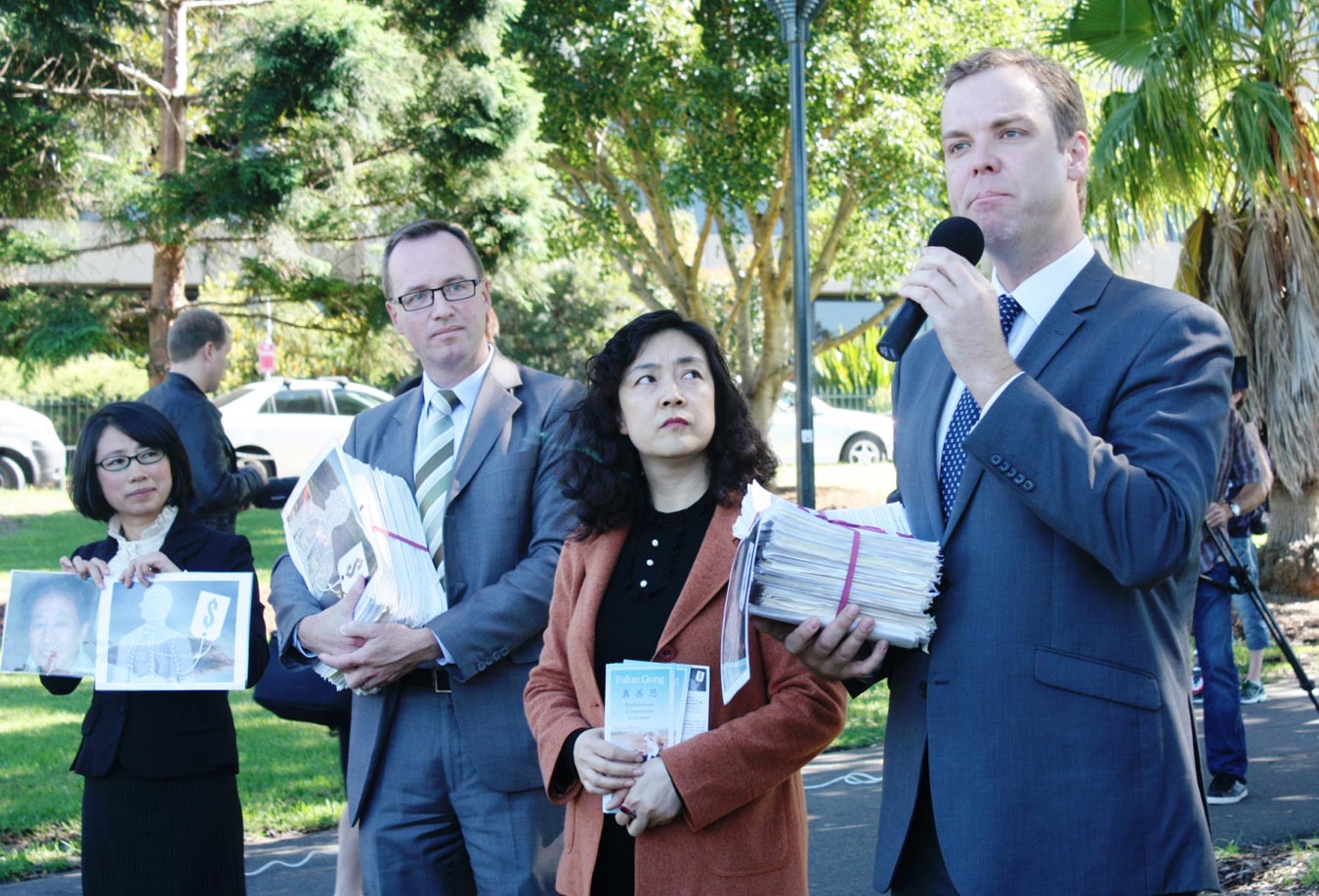 舒布瑞杰先生首先表示:“明天就是一九九九年‘四二五’法轮功学员和平请愿十四周年纪念日。十四年前的请愿是一个和平的请愿,法轮功学员非常有勇气的对中共政府说,请尊重我们的权利、尊重我们的信仰。明天就是法轮功请愿十四周年,同时也是中共政府开始对法轮功迫害了十四年。自从那一天开始许多法轮功学员开始被非法投入监狱进行酷刑折磨。今天我们在澳洲这块自由的土地上来用这样的方式来纪念这样的日子也是非常有意义的。我们今天就想非常明确的告诉大家,象这个签名信体现出来的一样,在澳洲你们有成千上万的支持者,我们支持你们在公开场合和平请愿的权利。我们也支持你们在中国也有如此和平请愿的权利。五月九日早上我会将正式向纽省议会提交这些征签信,今天在此的每一位也欢迎你们到议会来见证这非常有意义的历史过程。”