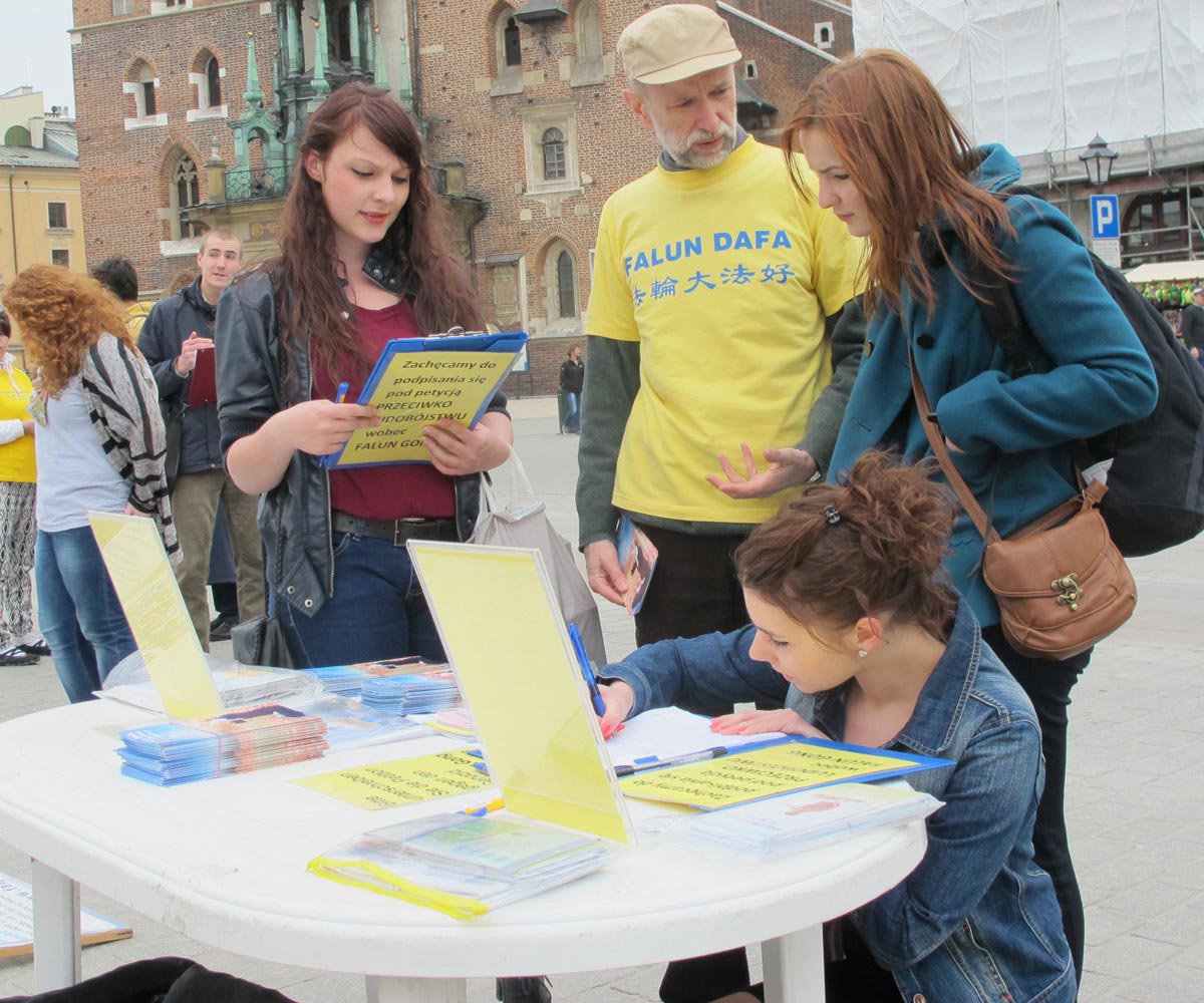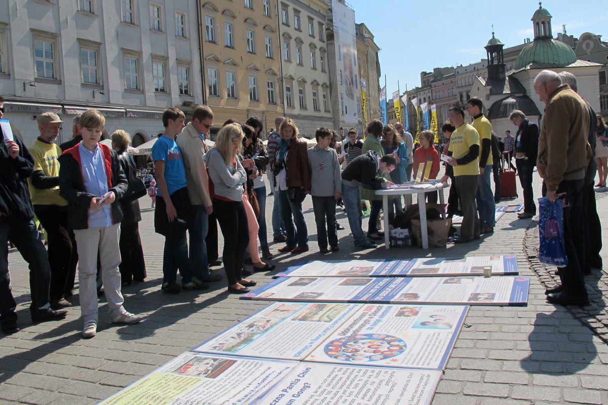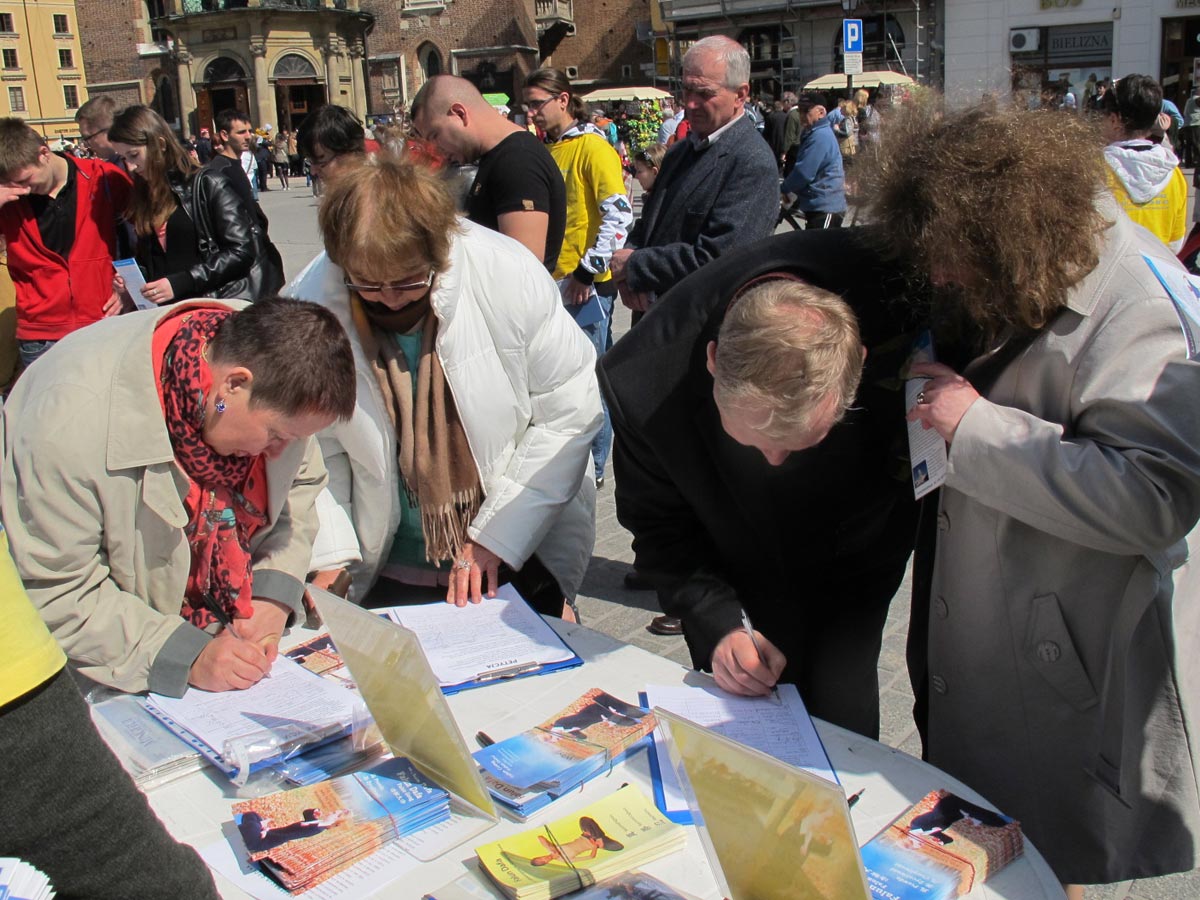 当天下午与周日下午,法轮功学员来到克拉科夫古城中心广场,支起展板和征签台,向过往游人介绍法轮功真相,吸引了大量观众驻足观看。展板上令人震惊的事实,使人们纷纷在征签簿上签名强烈谴责和反对活摘法轮功学员器官的罪恶行径、立即停止这种邪恶迫害。在六个小时中,有六百六十多名明真相游客参加了征签。