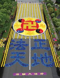 ![]() 二零一二年十一月十七日,五千名台湾法轮功学员在总统府前的广场上,排出“法正天地”及法轮功的标志法轮图形,场面宏伟壮观 |