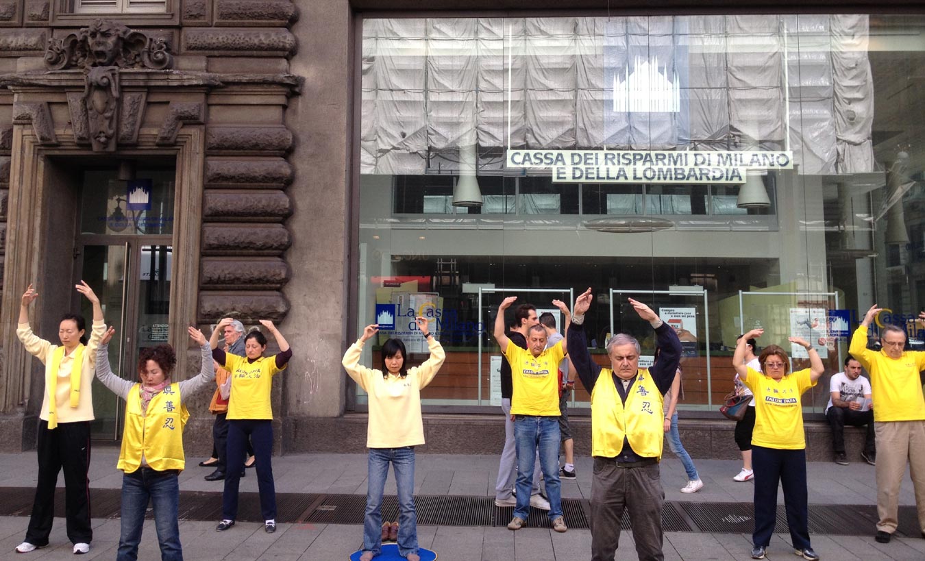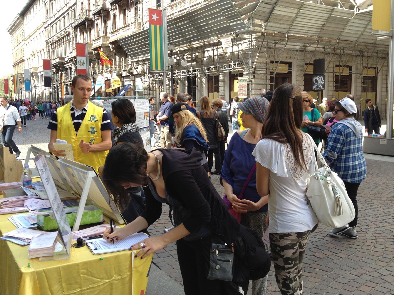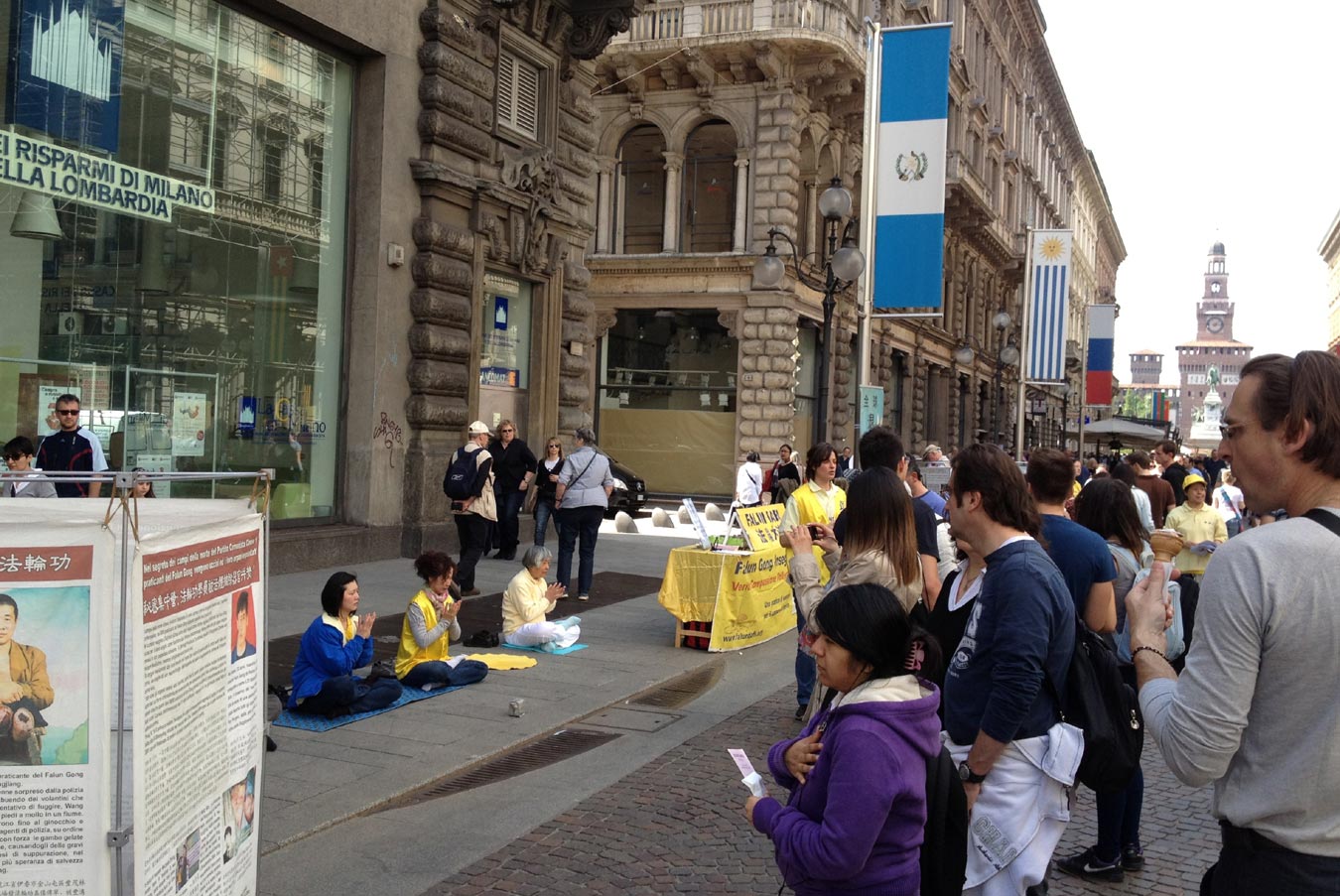 法轮功学员在著名的但丁街(Via Dante)上设立了信息台,并现场展示功法、真相展板和“三退”(退出中共党、团、队)服务等讯息,向意大利民众、海内外华人,以及来自世界各地的游客传播真相。