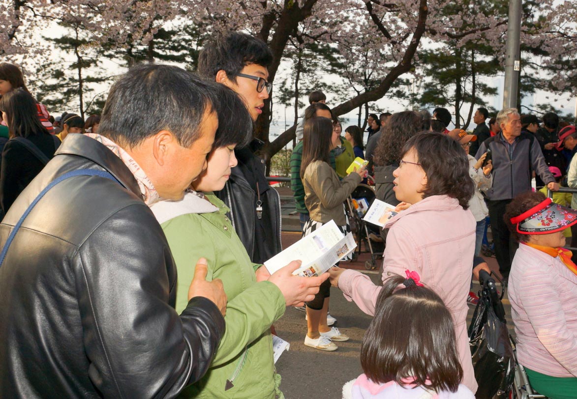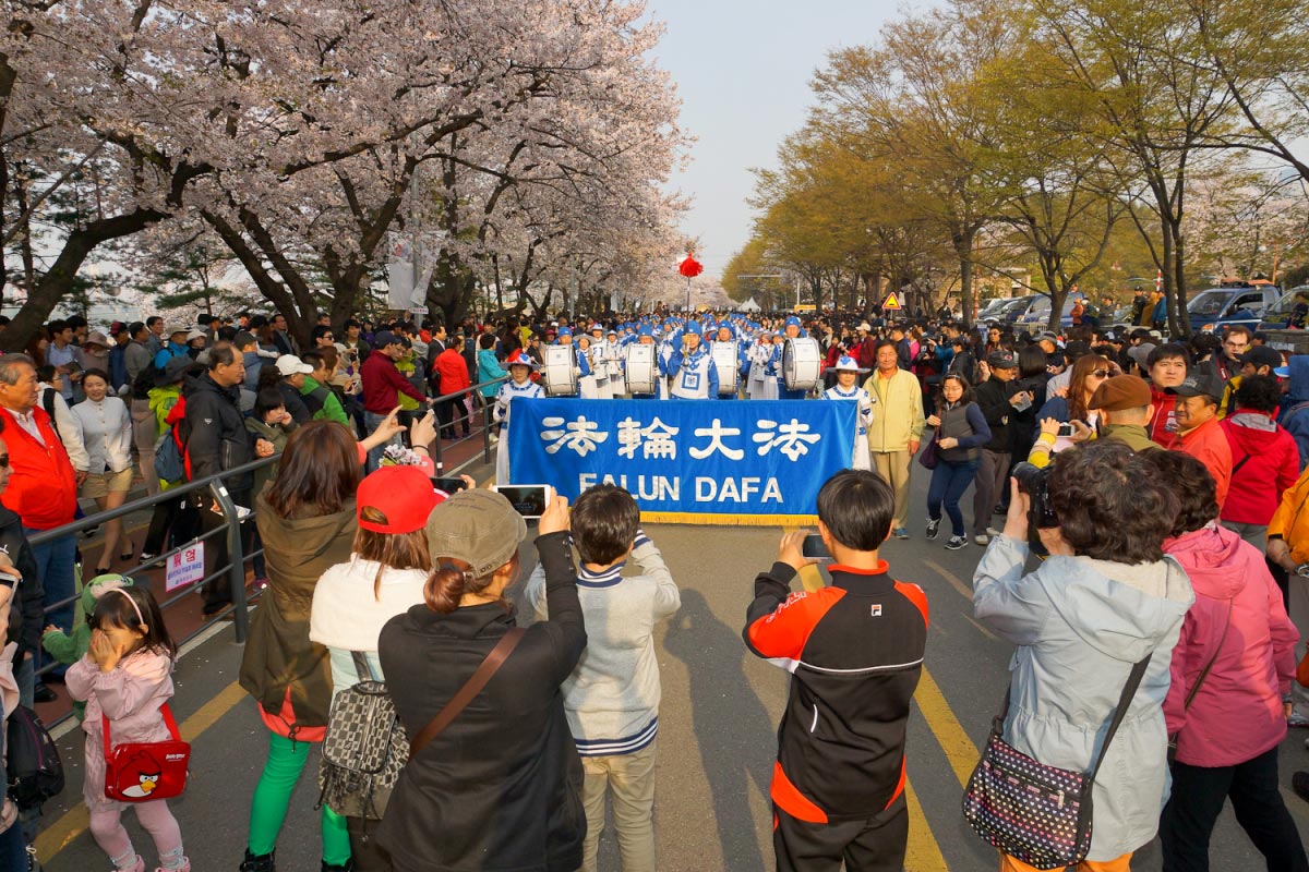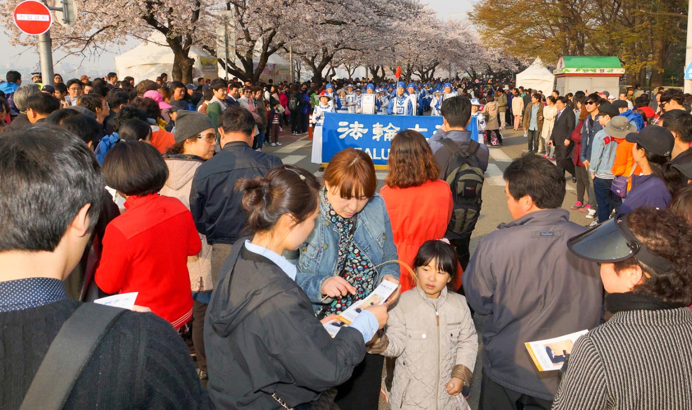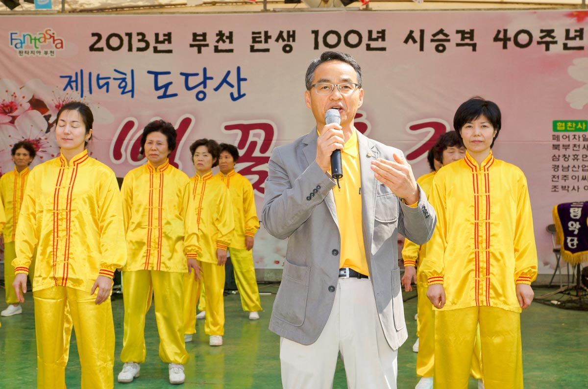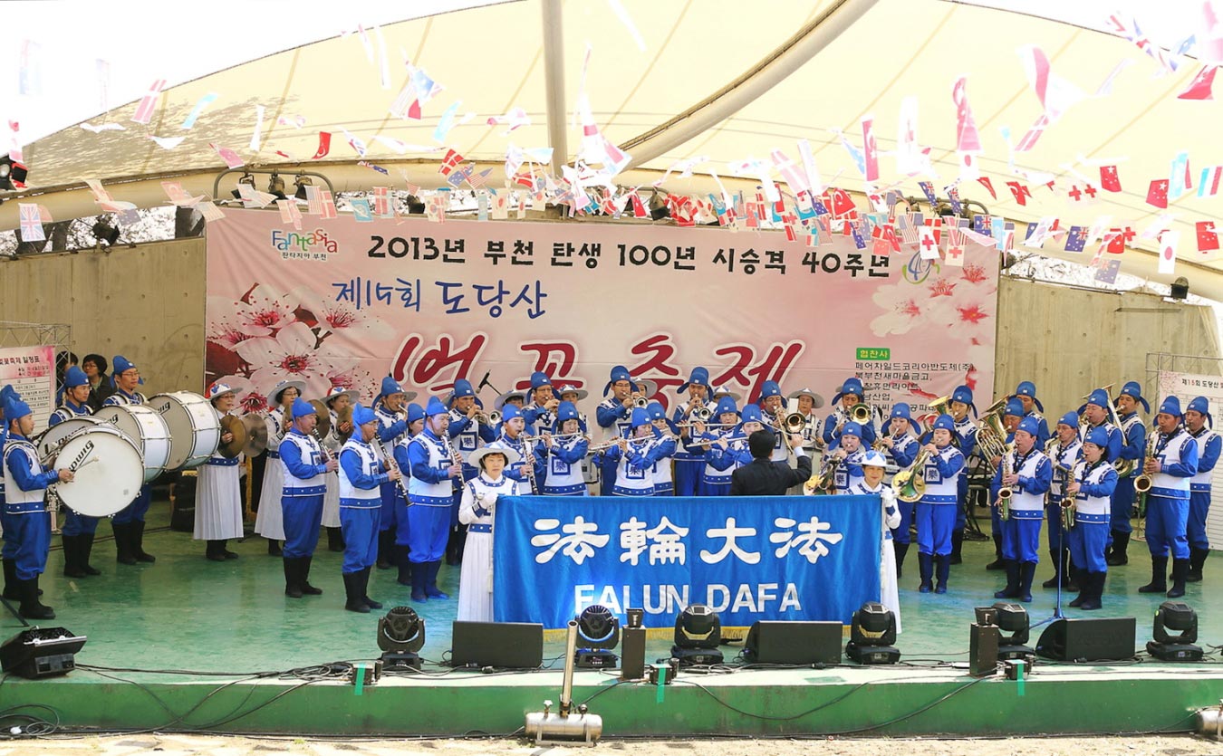 拥有八十八万人口的富川市临近首尔市,是每年举办“富川国际奇幻电影节”和“富川国际漫画节”等多种文化艺术活动的文化都市。法轮功学员从前年开始参加富川的地区庆典活动,并受到褒奖。今年已经是第十五届的陶唐山樱花庆典是富川地区的代表性活动,每年受到无数市民们的欢迎。