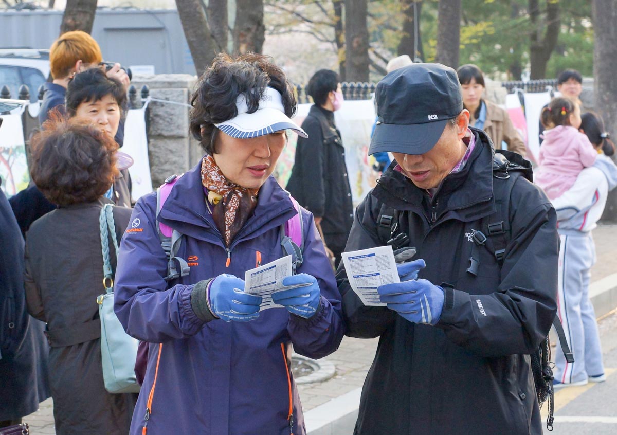 天国乐团队伍所经之处,游客们不断按动相机快门,忙于拍摄纪念。由于是首尔的最大庆典,来自中国、东南亚、西方的外国游客也很多,不仅有对法轮功的游行队伍表示惊诧的中国人,还有很多感兴趣的接受法轮功真相传单,并积极了解真相的市民们。