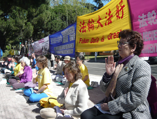 法轮功学员在现场展开“法轮大法好”、“四•二五和平上访十四周年”、“停止迫害法轮功学员”等大型横幅,前面摆放着一排揭露中共对法轮功学员实施酷刑迫害的真相展板。学员们向路人分发真相传单,讲述法轮功学员在中国遭受酷刑虐待和被活摘器官的真相并征集反迫害签名;另一些学员在悠扬的炼功音乐声中向世人展示法轮功五套优美祥和的功法。
