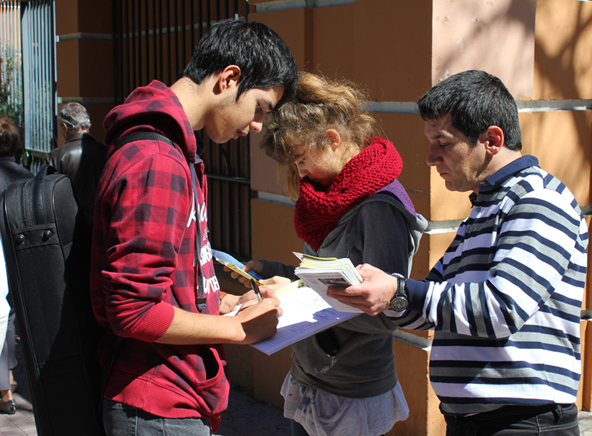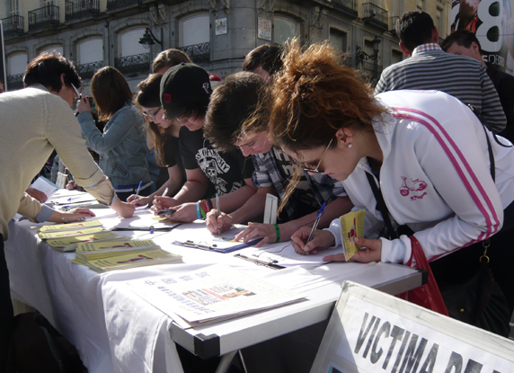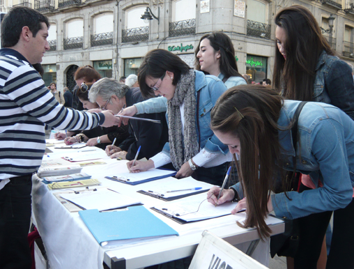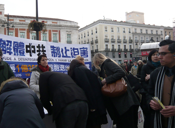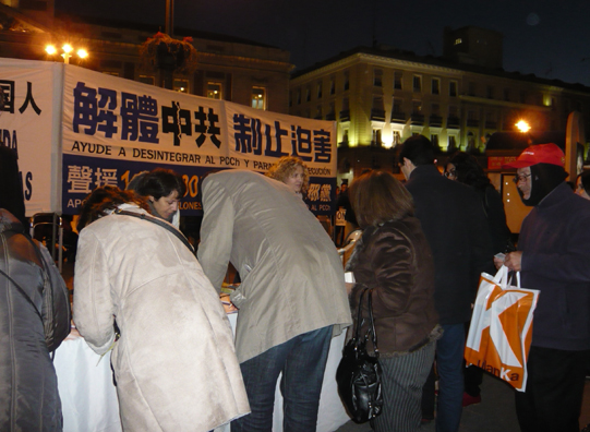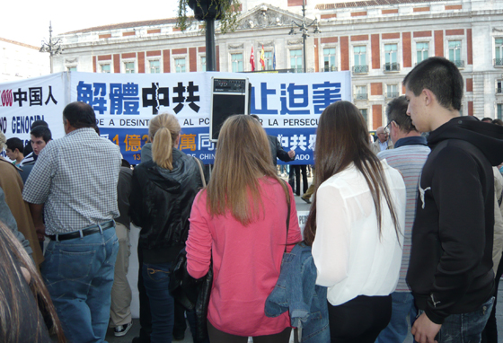 下午五点半到八点半,法轮功学员在马德里市中心太阳门广场集会,继续向世人揭露中共迫害法轮功、活摘法轮功学员器官的滔天罪行。人们了解真相后,纷纷前来签字声援法轮功反迫害。
