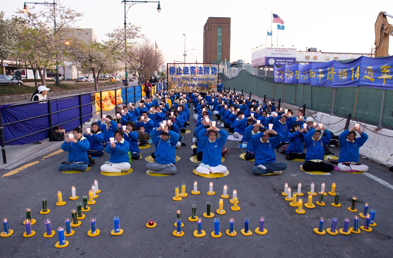 【明慧网二零一三年四月二十七日】二零一三年四月二十五日晚,为了纪念十四年前的“四二五”和平上访,纽约部份法轮功学员来到纽约中领馆前,举行烛光悼念,并呼吁制止中共对法轮功学员的残酷迫害