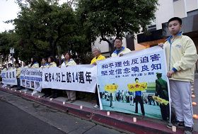 '二零一三年四月二十五日,洛杉矶法轮功学员在中领馆前集会,纪念“四·二五”和平上访十四周年。'