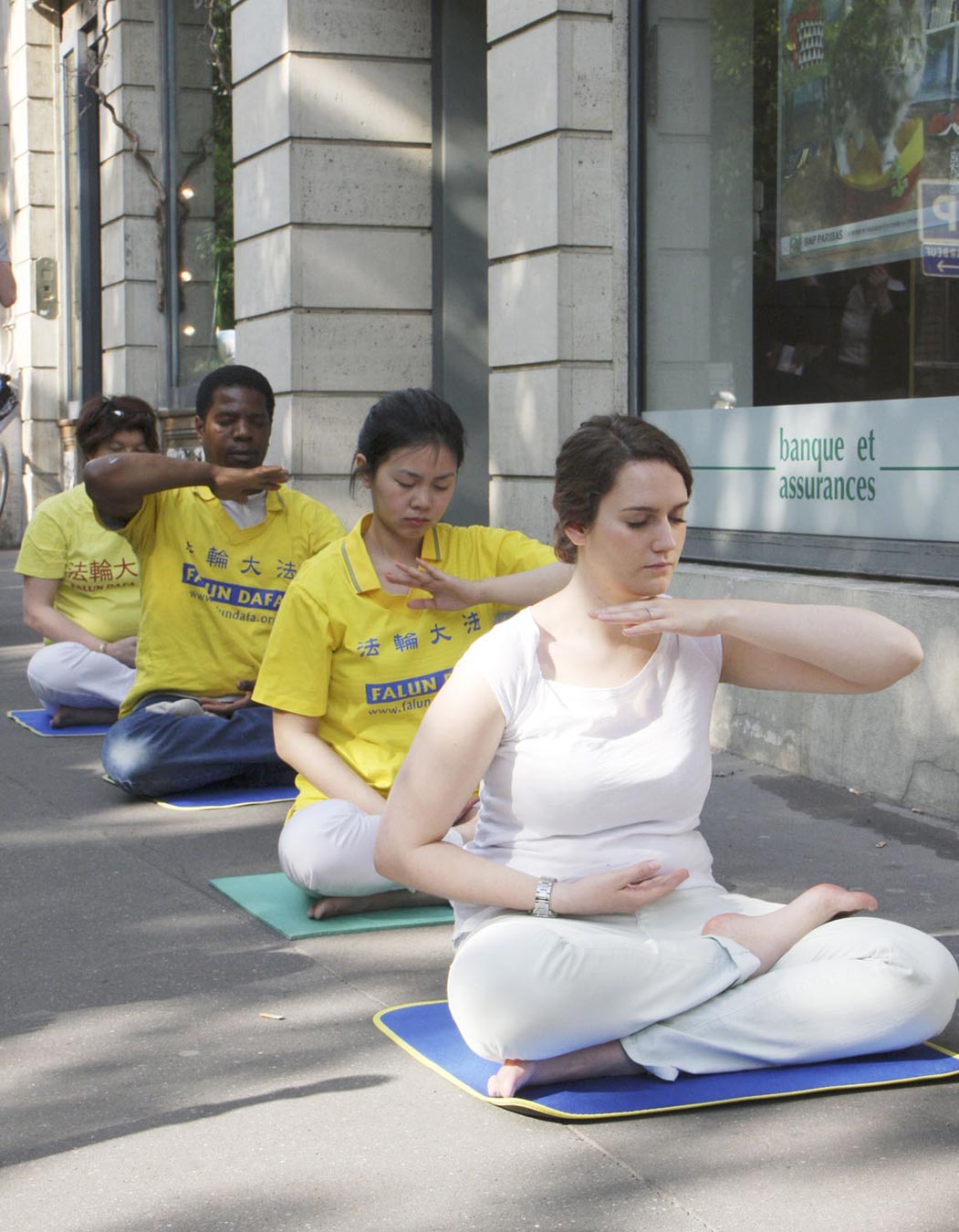 '法轮功学员通过功法演示向人们介绍法轮功'