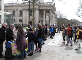 二零一三年四月二十七日,来自英国各地的法轮功学员在伦敦市中心的圣马丁广场举办活动,纪念“四二五”法轮功学员北京和平上访十四周年。