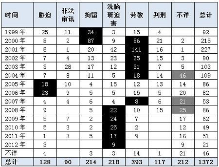 1999年7月20日到2012年10月底,我们通过明慧网共整理出1372例广西法轮功学员受迫害案例,发生在854名法轮功学员身上,平均每人受到1.6次迫害。本调查报告图1至图46统计数据,就是以这854名受迫害法轮功学员、1372例被迫害案例为统计基数而形成的。