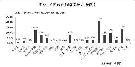 图37统计结果表明,广西13年迫害中,北海地区迫害案例最多,南宁地区排第二,玉林地区排第三,百色地区排第四。