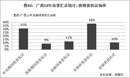 图43统计结果表明,在“绝食抗议”的反迫害案例中,38%发生在劳教所内,比例最高,31%发生在审讯期间,12%发生在洗脑班迫害期间,10%发生在监狱内,9%发生在拘留期间。