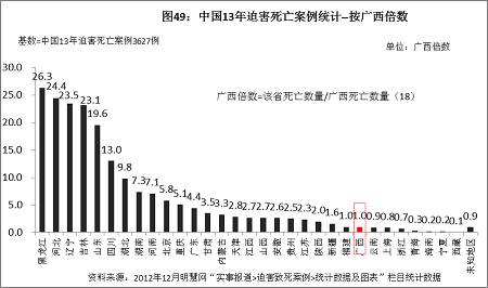 也就是说,全国32个省直辖市,除福建、云南、上海、浙江、青海、海南、宁夏、西藏这8个省之外,在中国75%的国土上,24个省的迫害程度都比广西严重,尤其东三省与河北尤其严重,是广西的20倍以上,山东也有19.6倍。而如果我们把北京重庆看成一个市,而不是一个省级单位时,那么,这两个市的迫害严重程度应该属于20倍广西倍数阵列之内,而上海也比广西严重多倍。