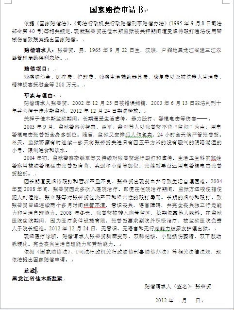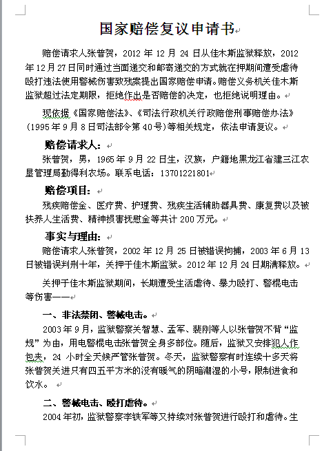 张普贺出狱后,为揭露佳木斯监狱对其十年残酷迫害,维护自己的权益,聘请北京律师就自己被佳木斯监狱迫害致残一案申请国家赔偿。律师按法律程序于二零一二年十二月二十七日向佳木斯监狱狱政科递交了《国家赔偿申请书》等相关法律文书,由于狱政科刘科长不在,律师将法律文书留在那里,并在一周内用特快专递将上述法律文书寄给佳木斯监狱狱政科长和监狱长各一份。