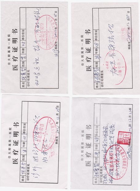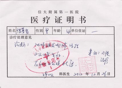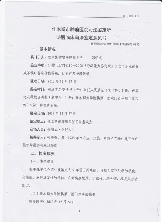 二零一三年一月十五日上午,两位律师又专程到佳木斯监狱狱政科递交了《法医鉴定书》。见到了科长,他不说姓名,律师认出他是刘晓青(原六监区区长)。当时屋子里还有两个气势汹汹的警察,要把其中一位律师撵出去,分开对付,没有得逞。刘晓青看到律师给的材料,态度蛮横说:“法鉴,单方鉴定不生效。他说的话不真实,我们要见他本人核实。”其目的是要对张普贺直接下手,勤得利农场“六一零”也在追查张普贺的下落,并对张三江说,要把张普贺送洗脑班。