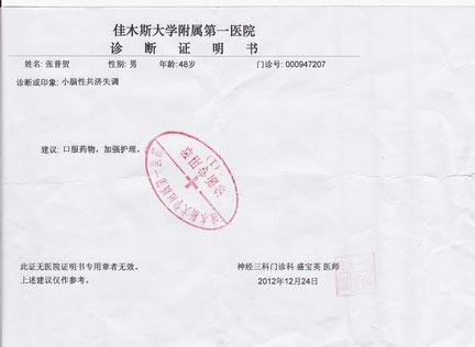 佳木斯监狱恶警以不背“监规”、不放弃修炼法轮功、学法、炼功为由,多次暴力殴打、长时间用三万伏高压电棍电击张普贺全身多部位,导致脑部受损,肢体出现障碍,消化功能失调,长达数年拉肚,身体虚弱,营养不良,每当出现贫血昏迷时,都被人抬到医院救治。