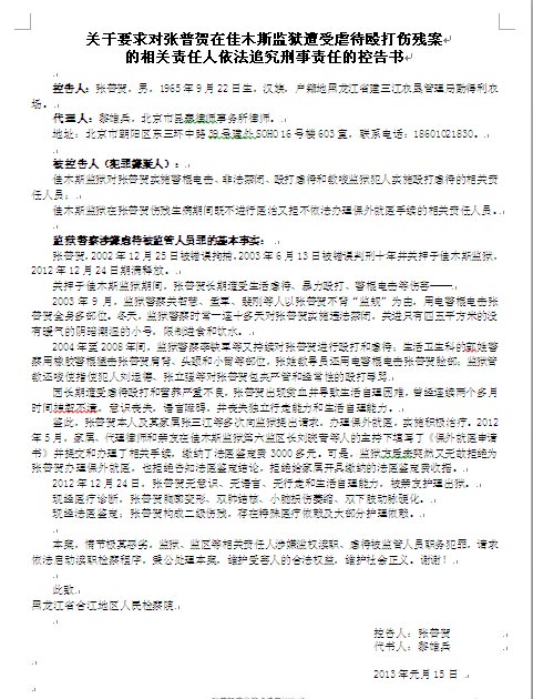 二零一三年一月十五日下午,两位北京律师去黑龙江省合江地区检察院递交《关于要求对张普贺在佳木斯监狱遭受虐待殴打伤残案的相关责任人依法追究刑事责任的控告书》,依法控告佳木斯监狱对张普贺实施警棍电击、非法禁闭殴打虐待和教唆监狱犯人实施殴打虐待的相关责任人员;控告佳木斯监狱在张普贺伤残生病期间既不进行医治又拒不依法办理保外就医手续的相关责任人员。因检察长不在,一女办事员张立接待了两位律师并收下了材料,说两个月内答复。